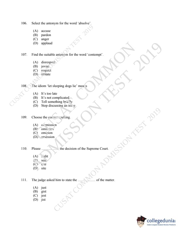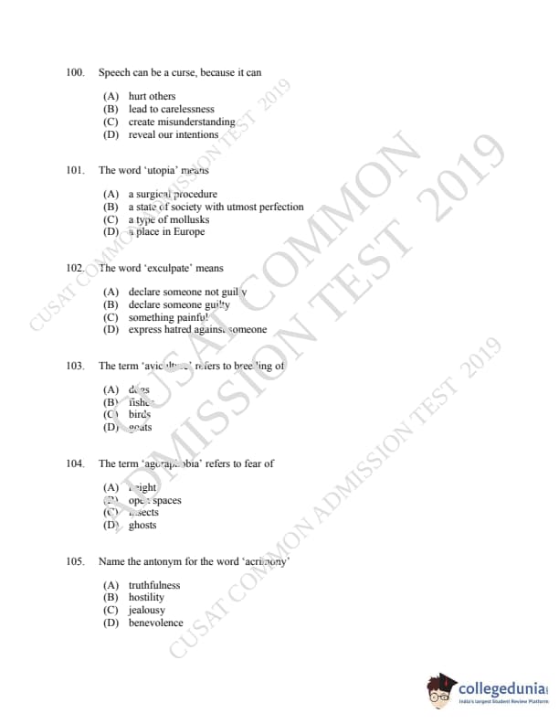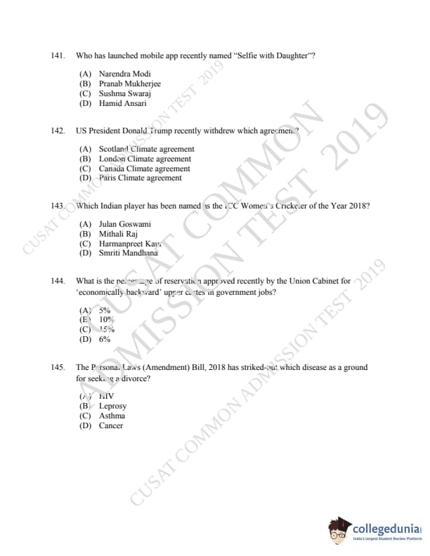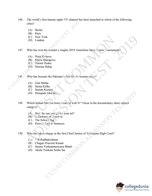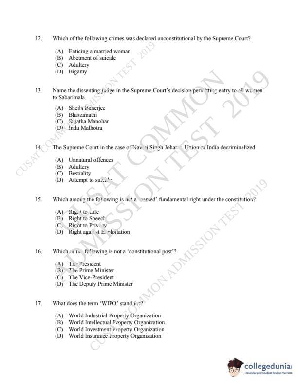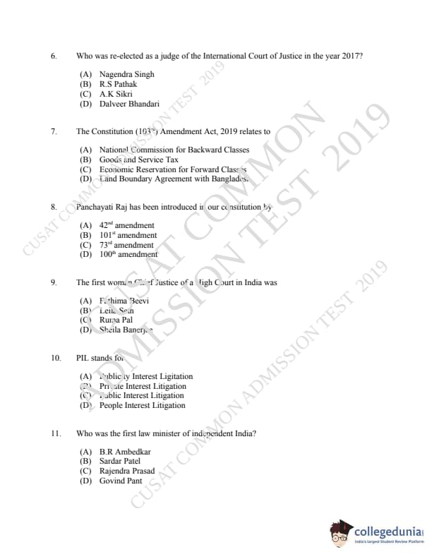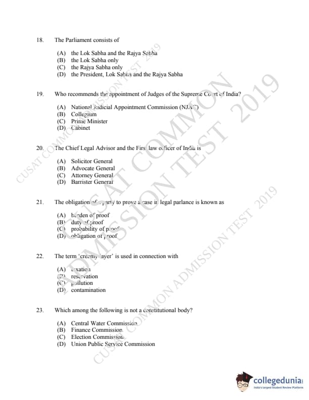 CUSAT CAT 2019 5 Year LLB Question Paper with Answer Key PDFs