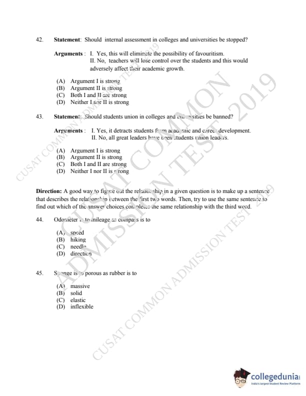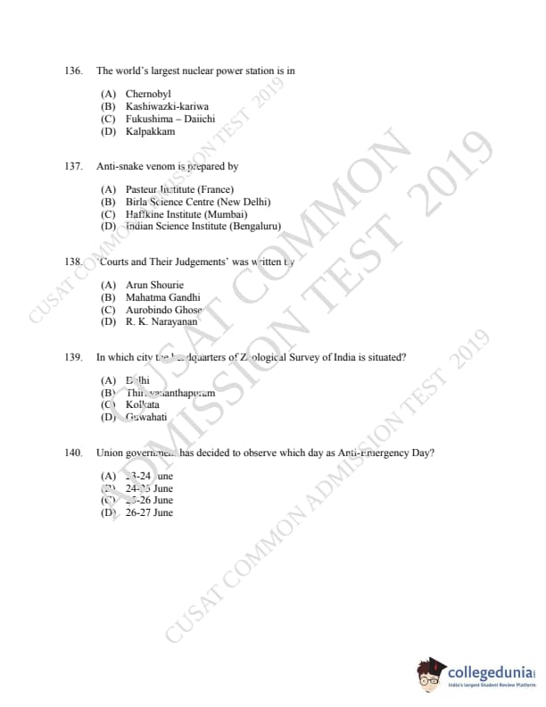 CUSAT CAT 2019 5 Year LLB Question paper with answer key pdf is available for download. The exam was successfully organized by Cochin University of Science & Technology. The question paper comprised a total of 150 questions.