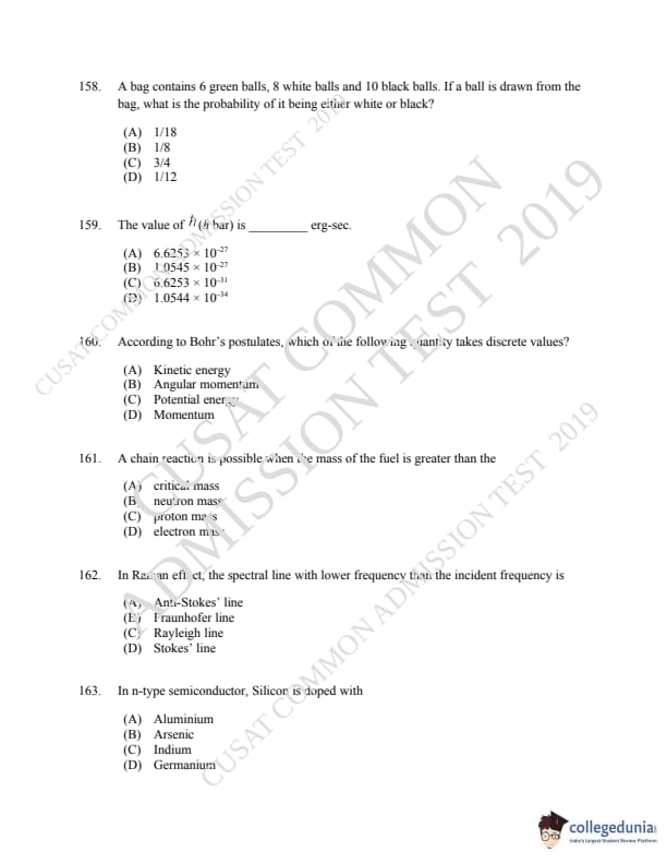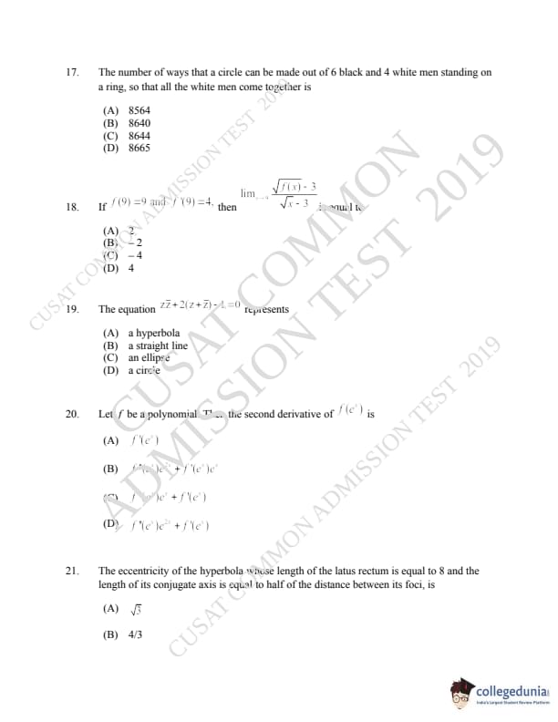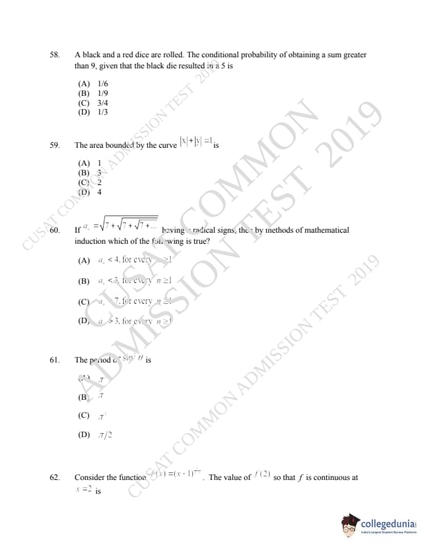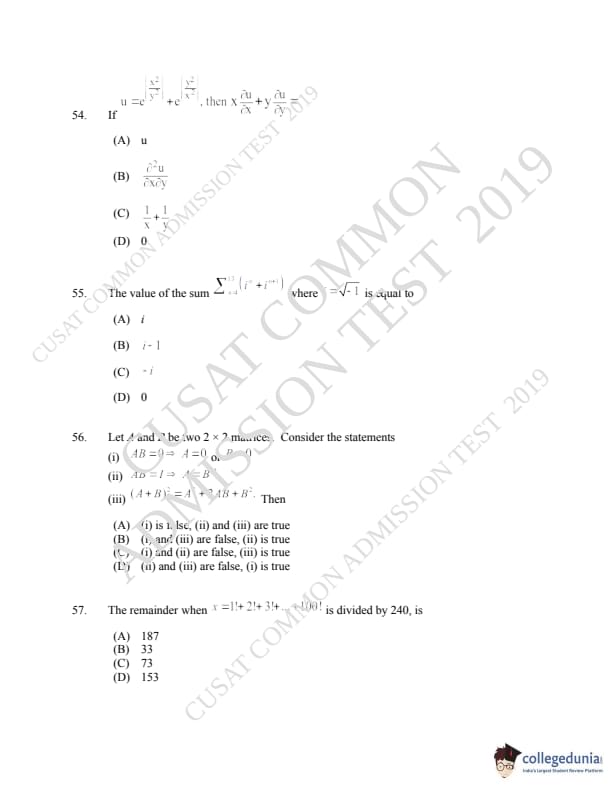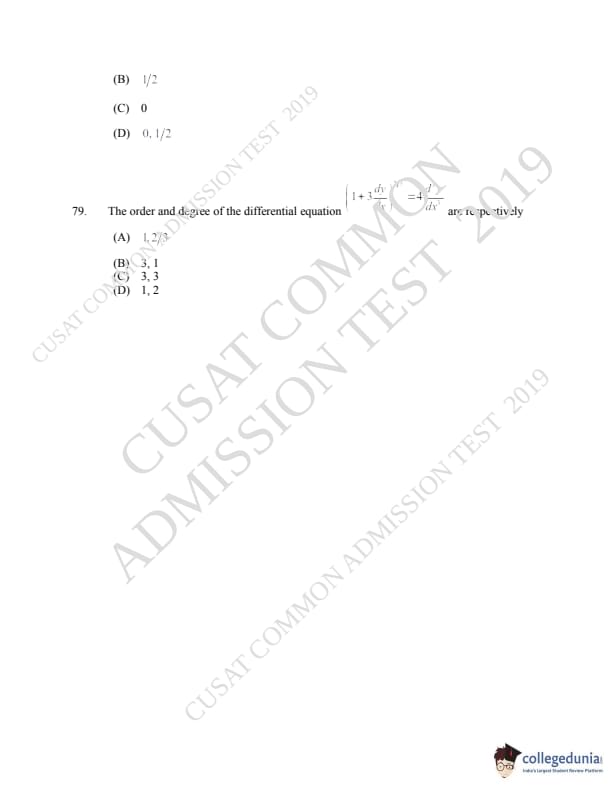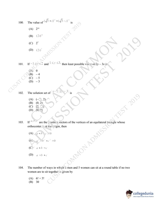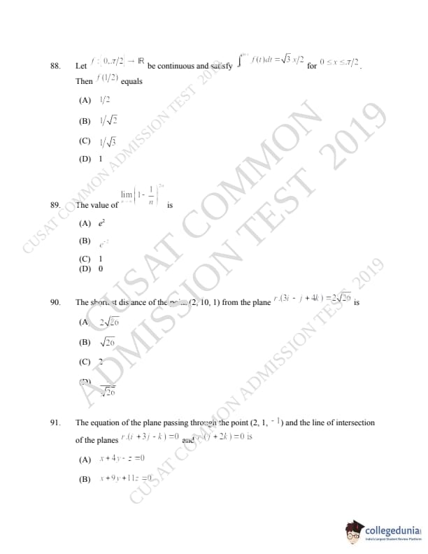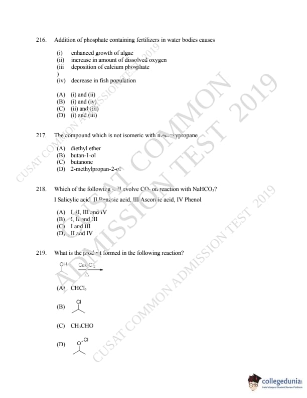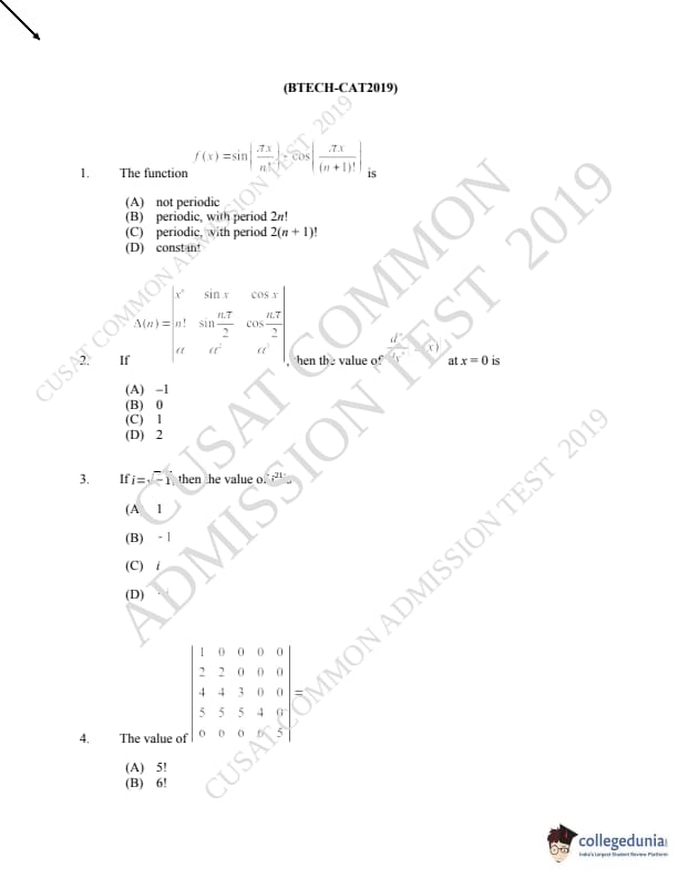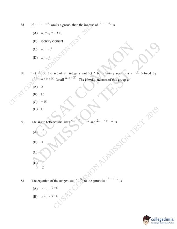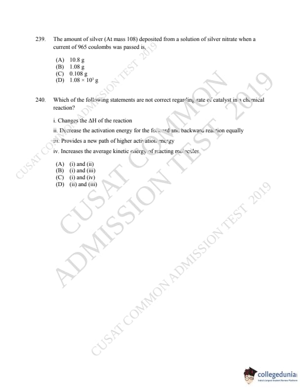 CUSAT CAT 2019 B.Tech Question Paper with Answer Key PDFs