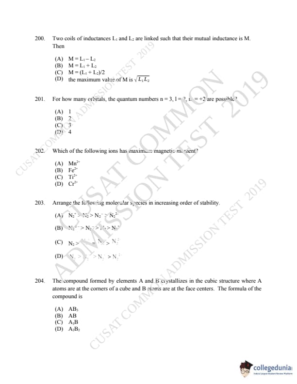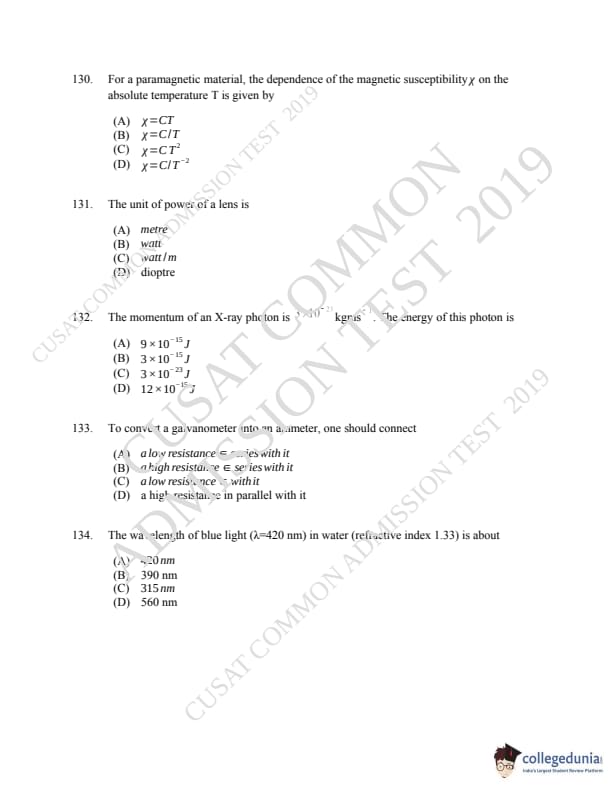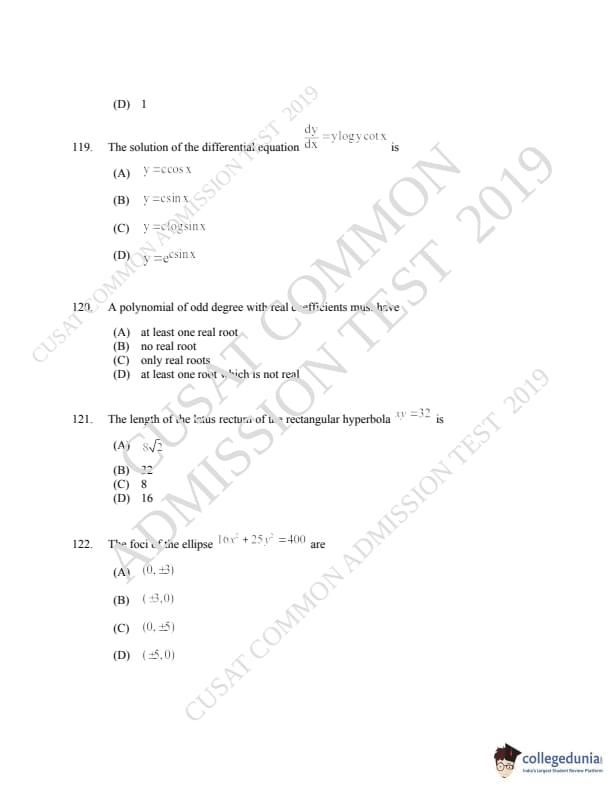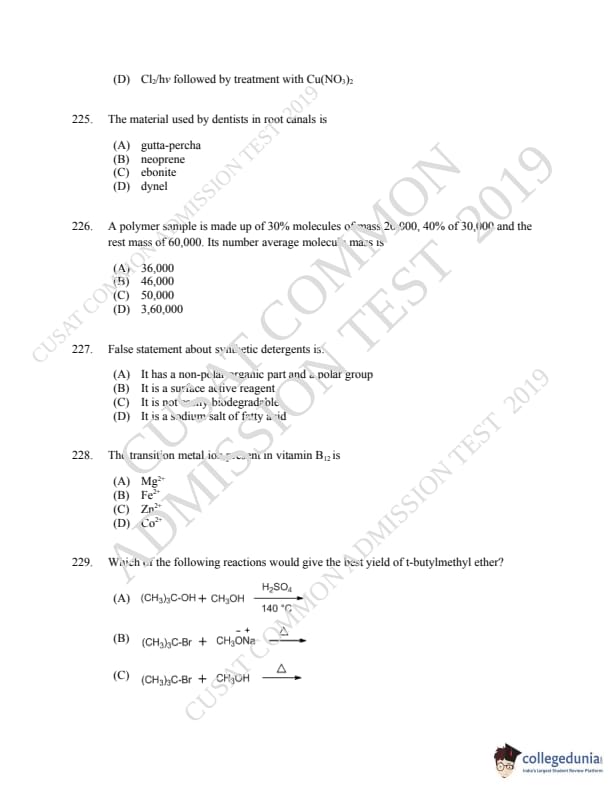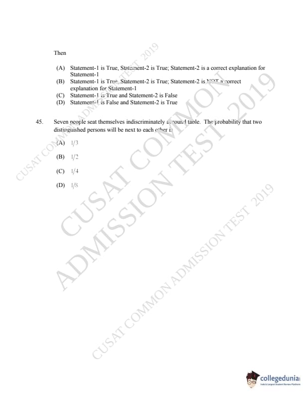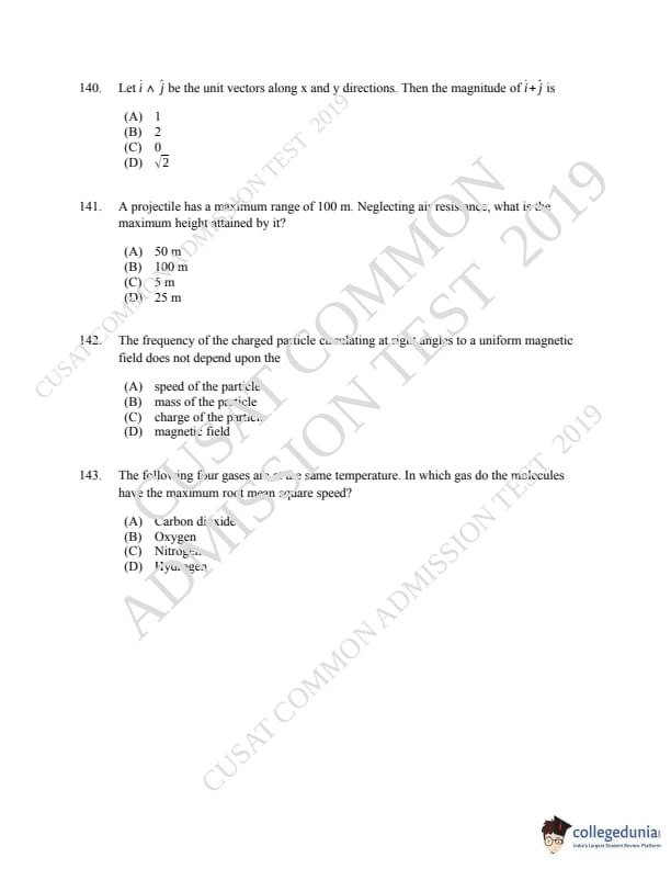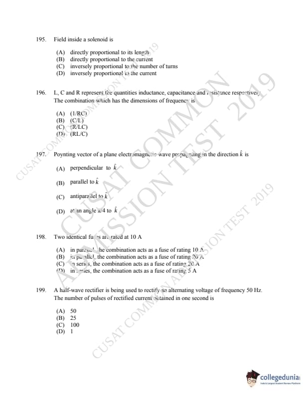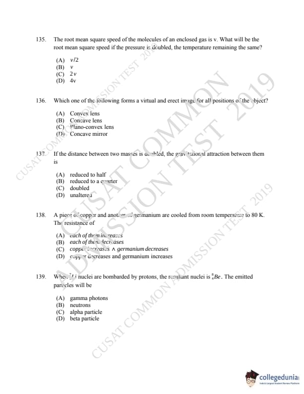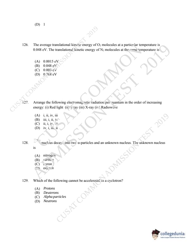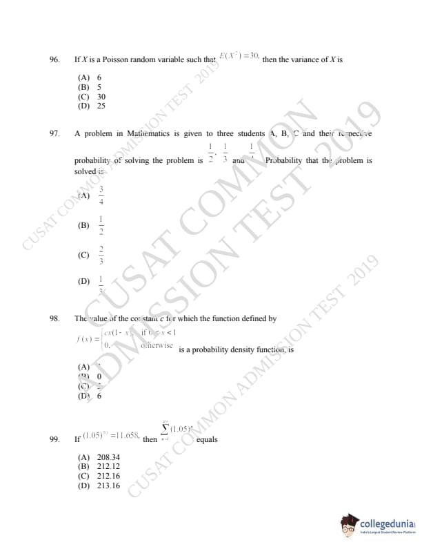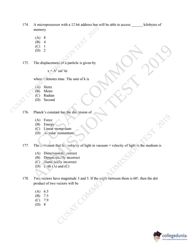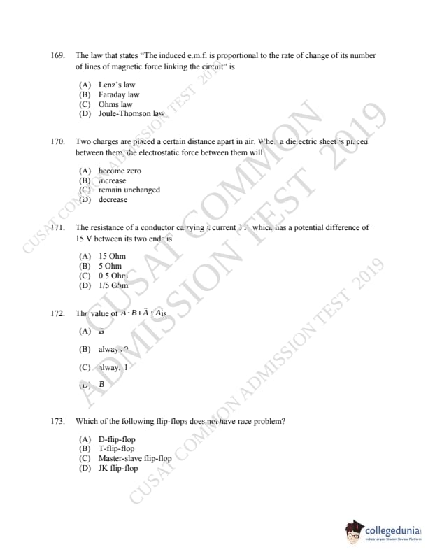 CUSAT CAT 2019 B.Tech Question paper with answer key pdf is available for download. The exam was successfully organized by Cochin University of Science & Technology. The question paper comprised a total of 250 questions.