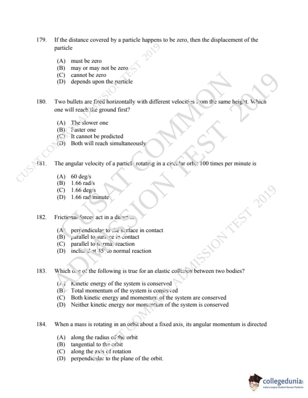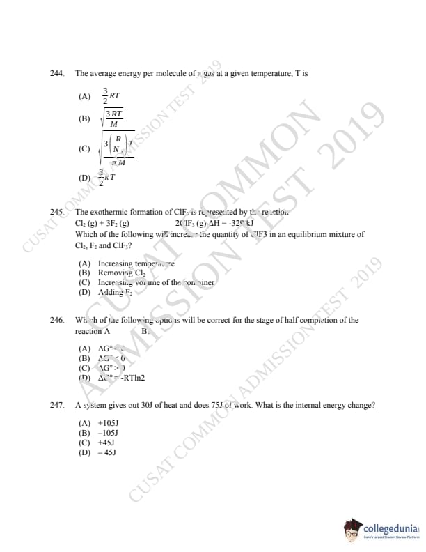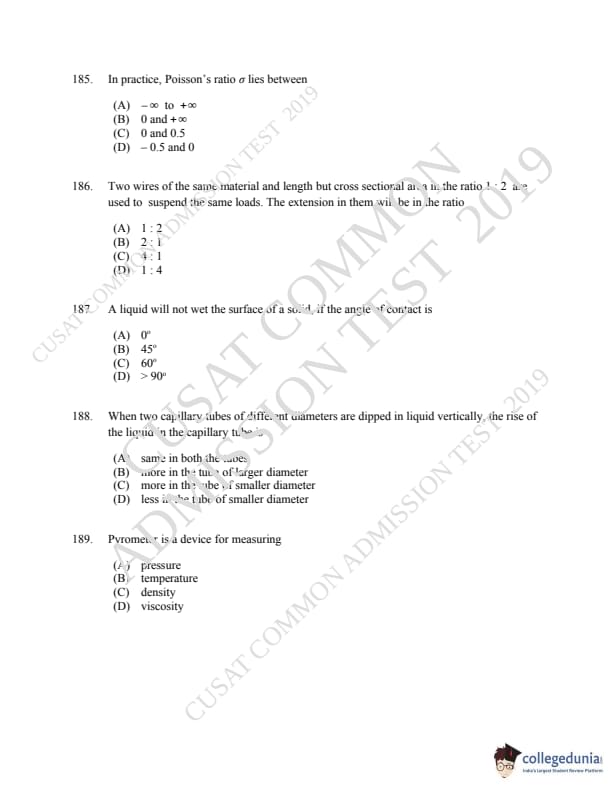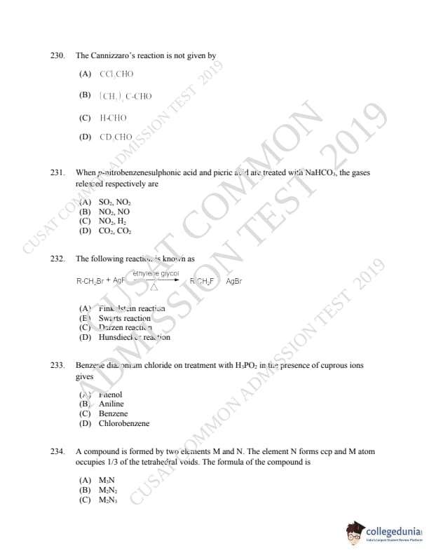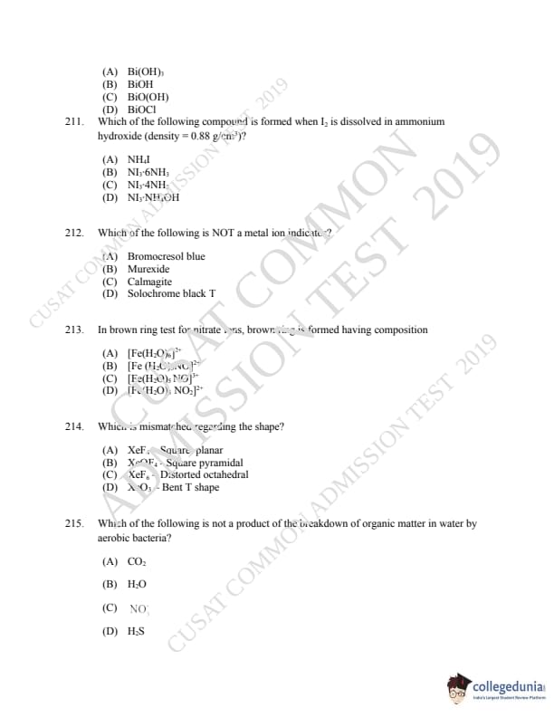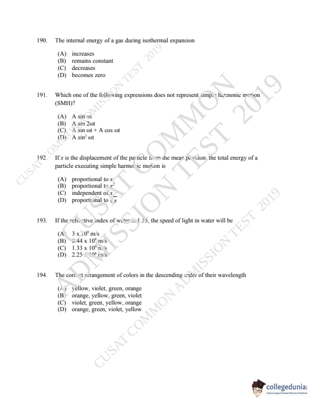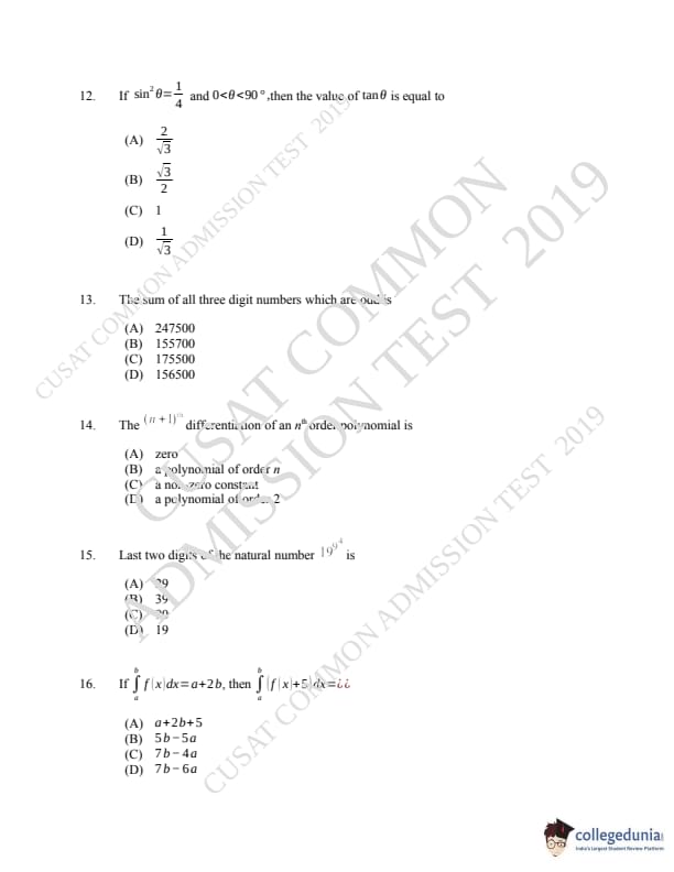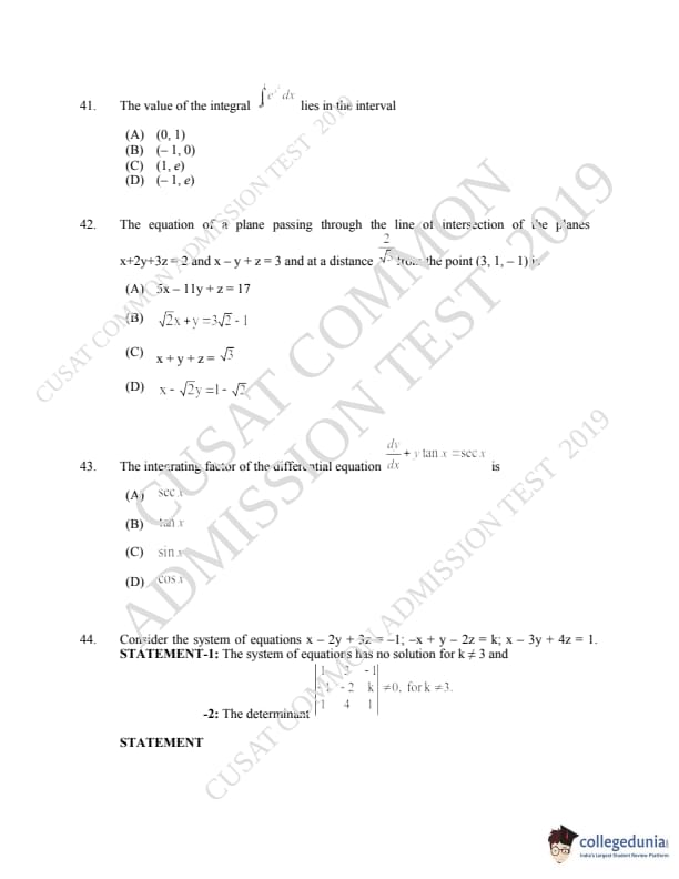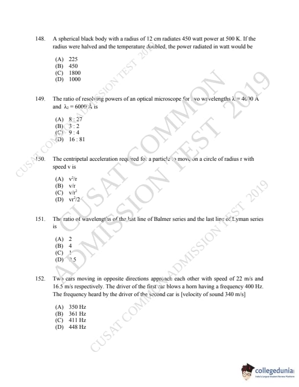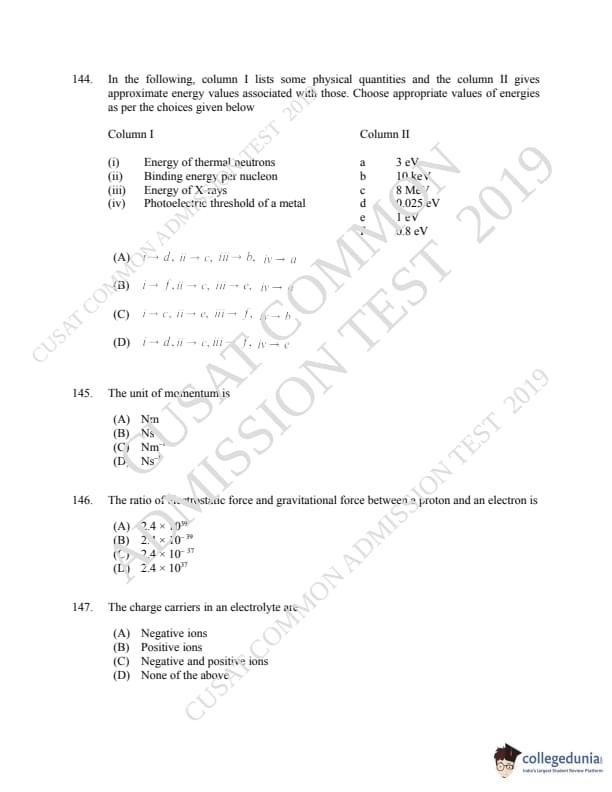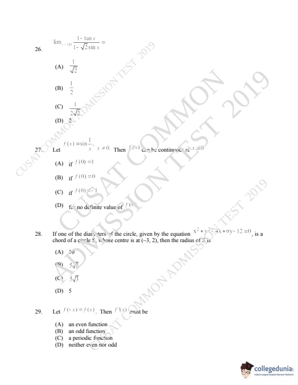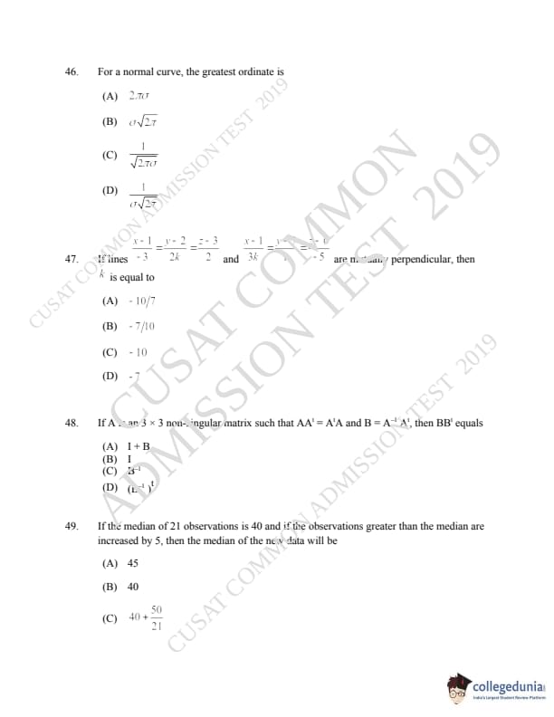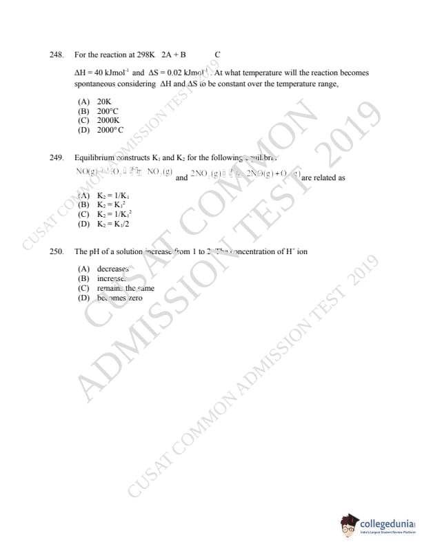 CUSAT CAT 2019 B.Tech Question paper with answer key pdf is available for download. The exam was successfully organized by Cochin University of Science & Technology. The question paper comprised a total of 250 questions.