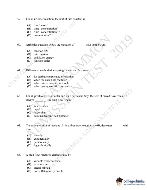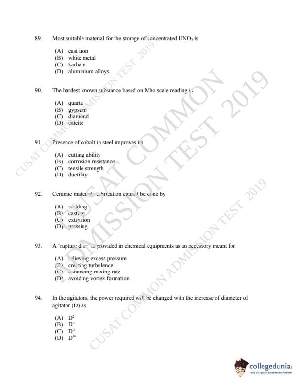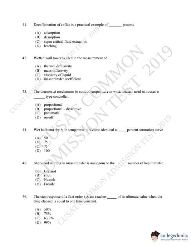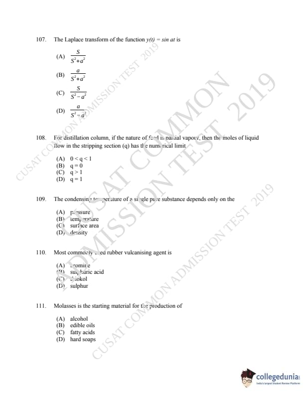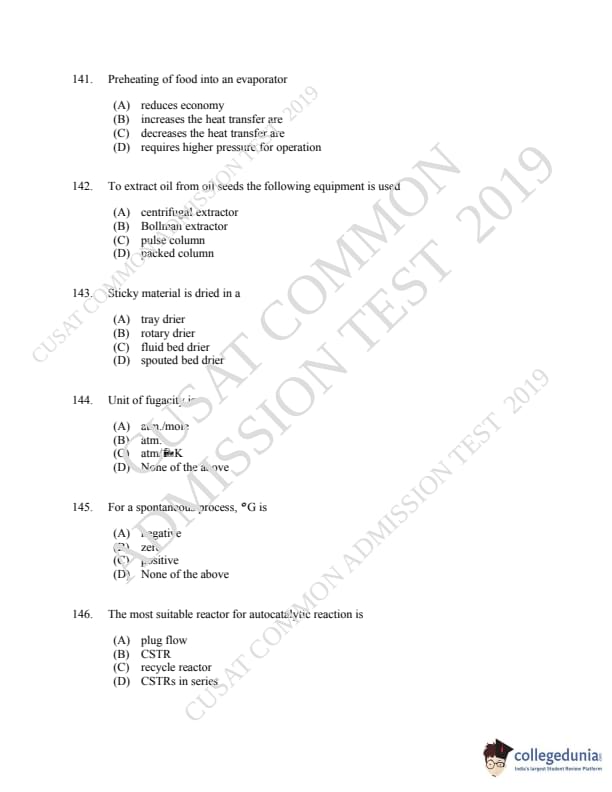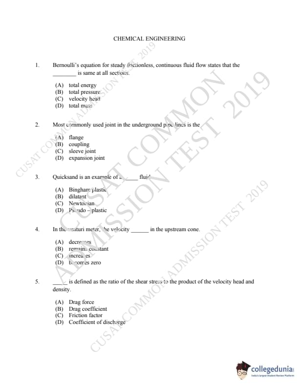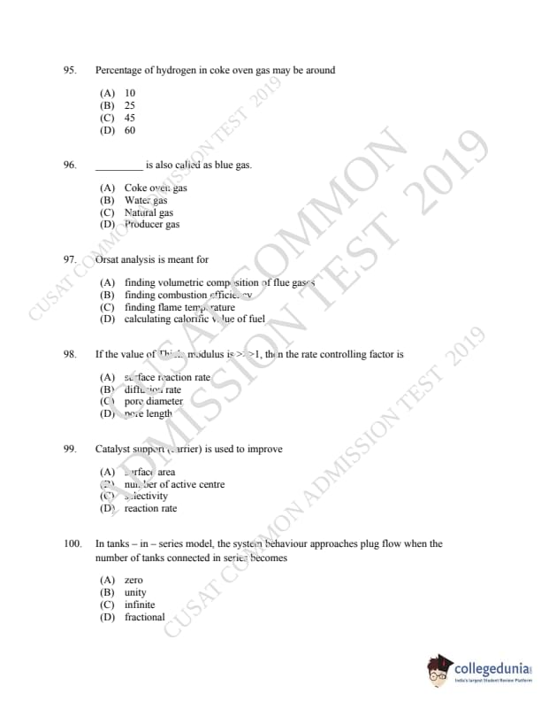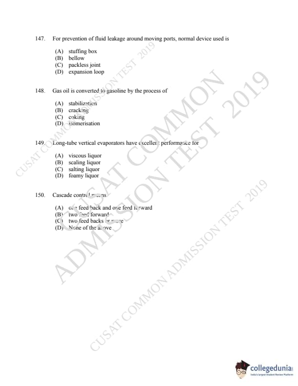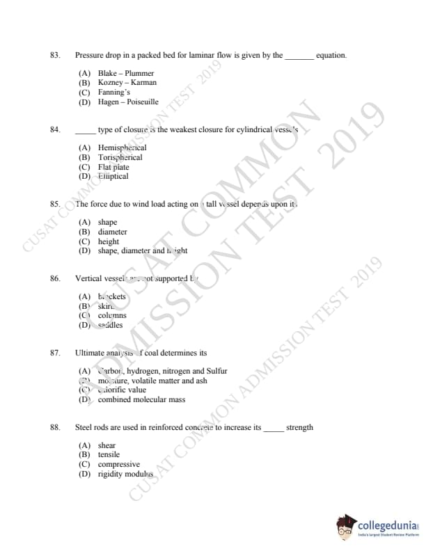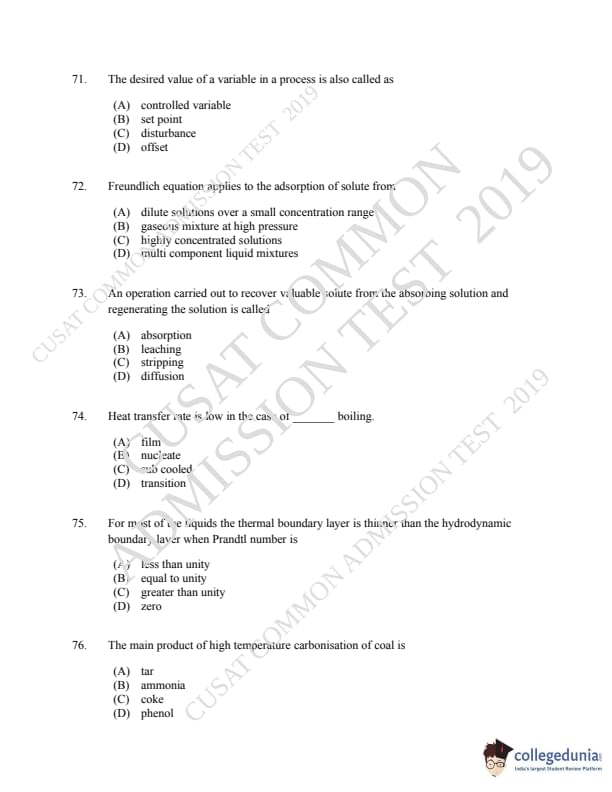 CUSAT CAT 2019 Chemical Engineering Question paper with answer key pdf is available for download. The exam was successfully organized by Cochin University of Science & Technology. The question paper comprised a total of 150 questions.