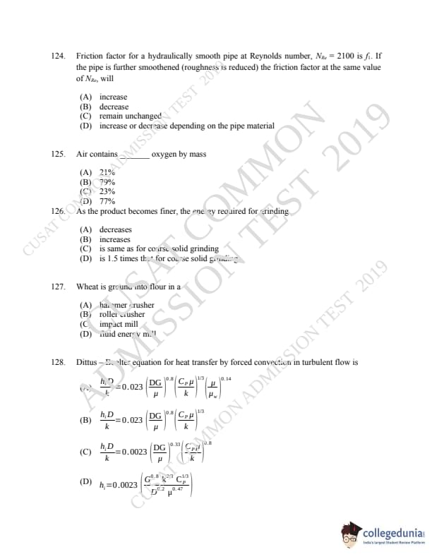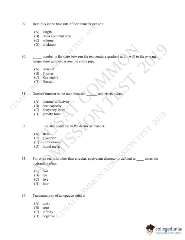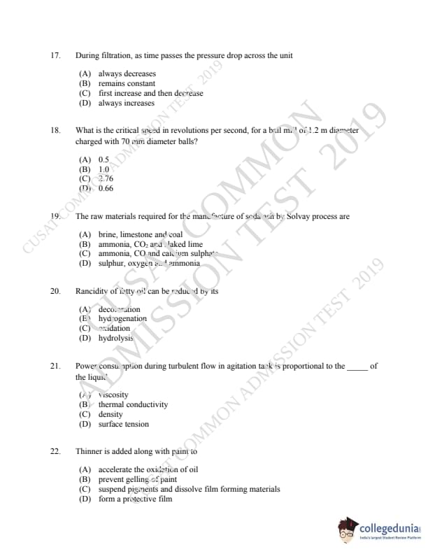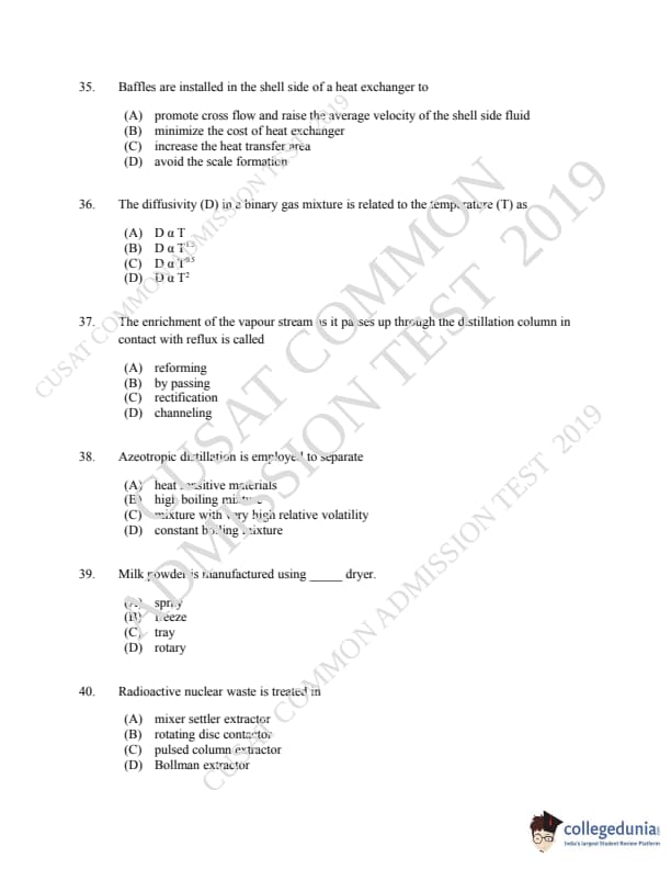 CUSAT CAT 2019 Chemical Engineering Question Paper with Answer Key PDFs