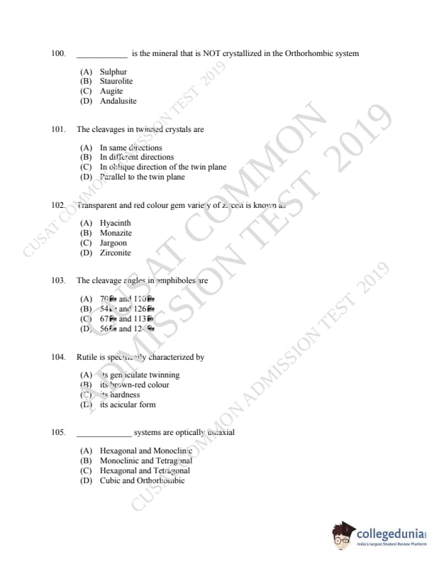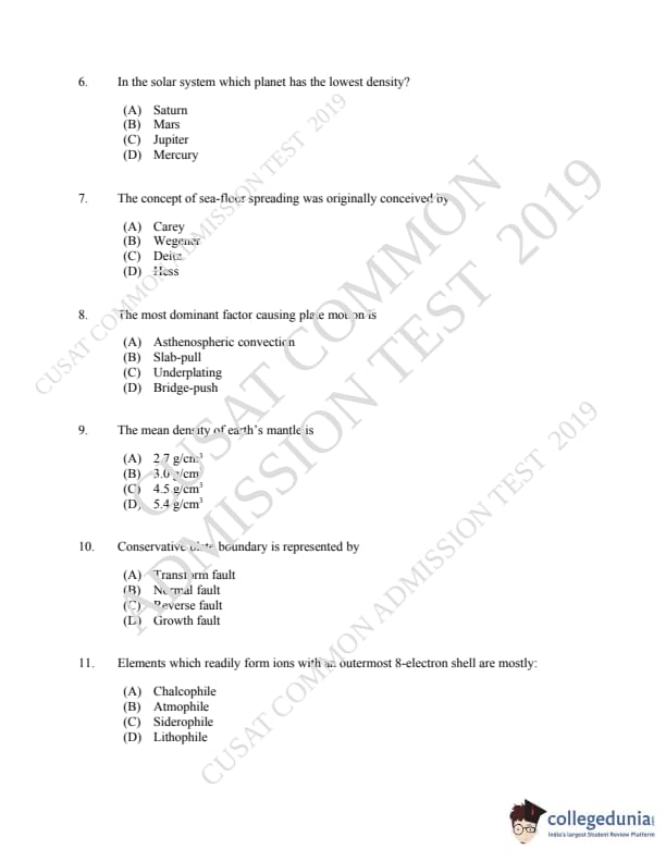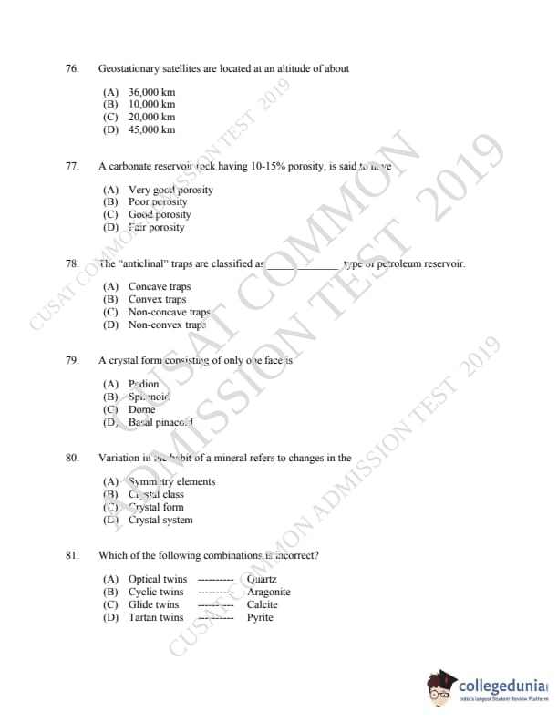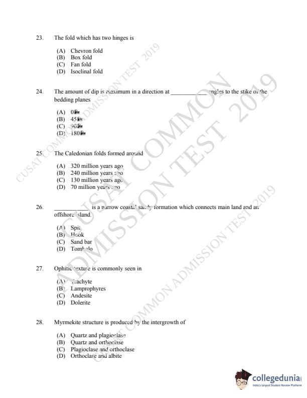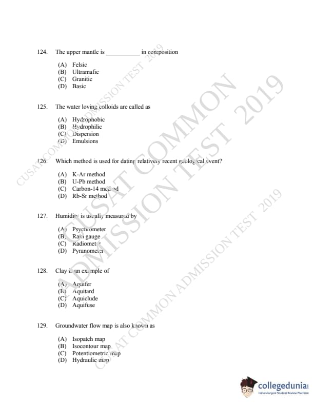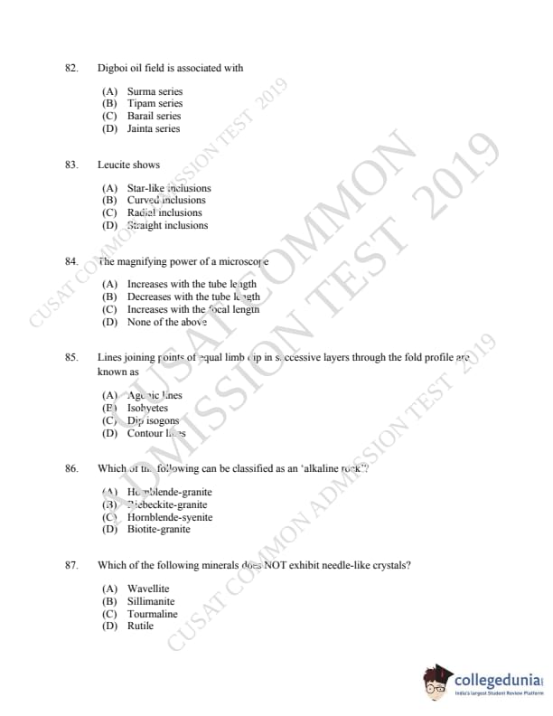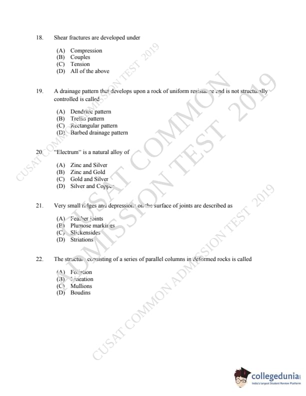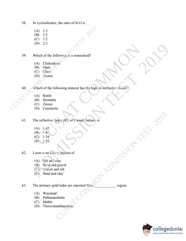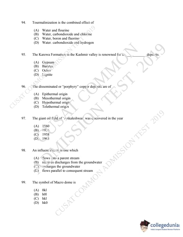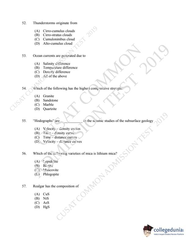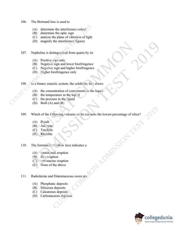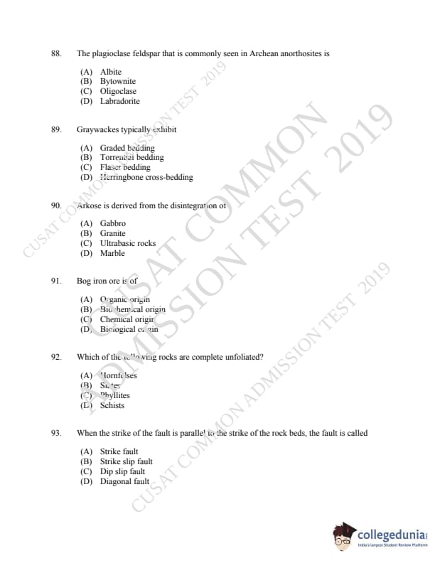 CUSAT CAT 2019 Geology Question Paper with Answer Key PDFs