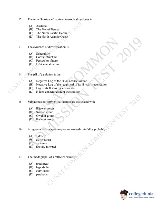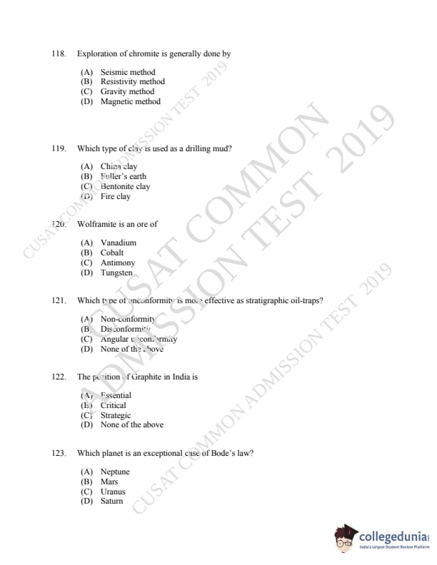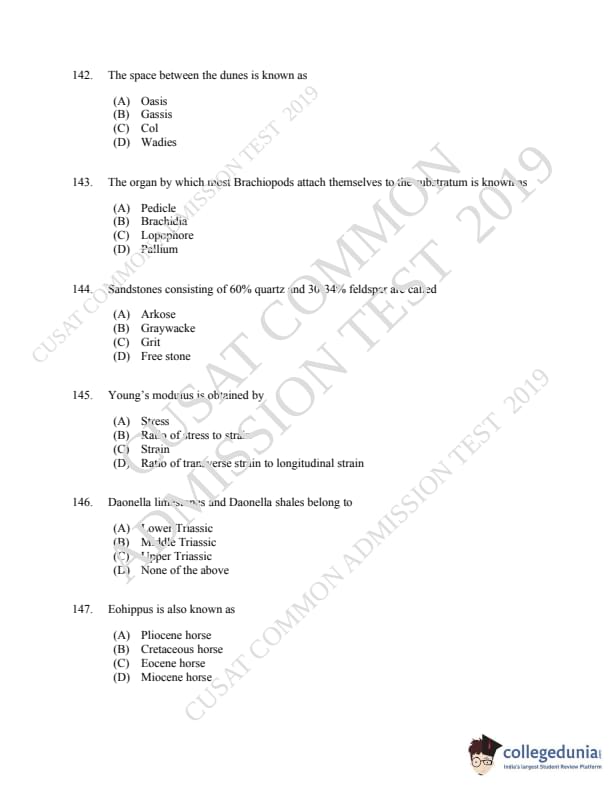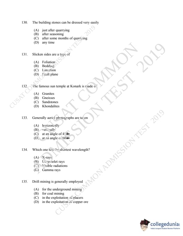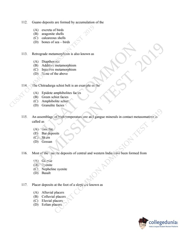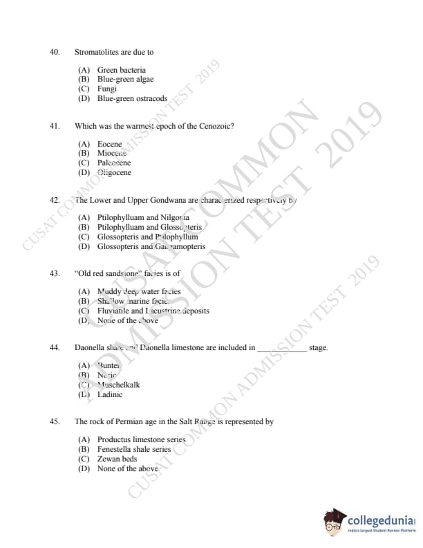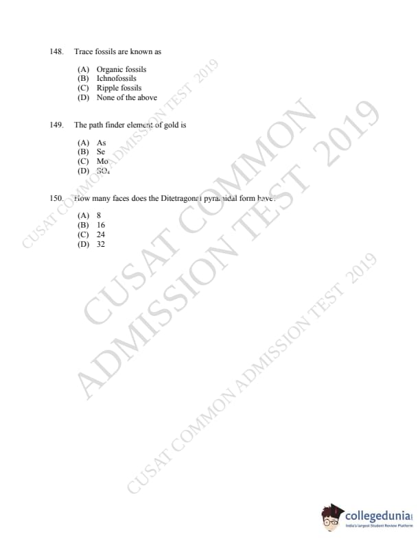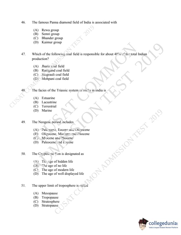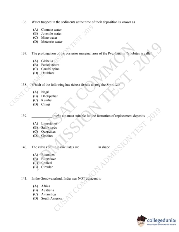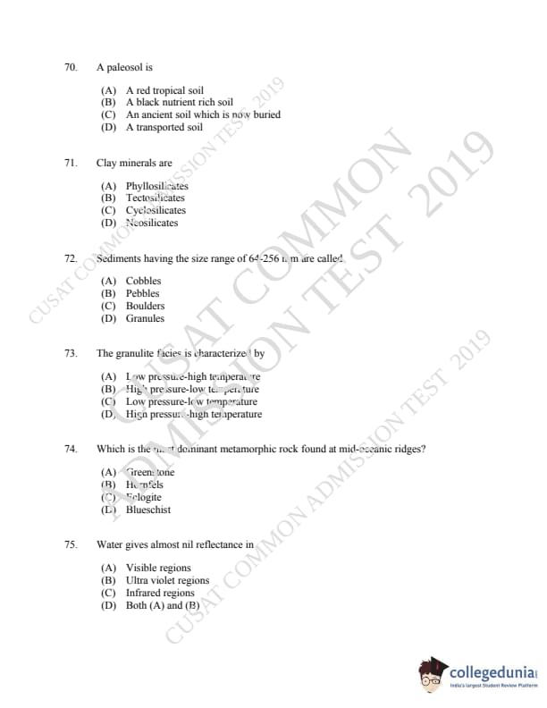 CUSAT CAT 2019 Geology Question paper with answer key pdf is available for download. The exam was successfully organized by Cochin University of Science & Technology. The question paper comprised a total of 150 questions.