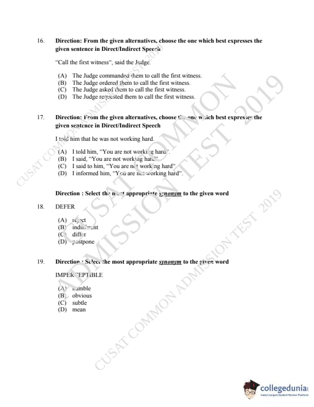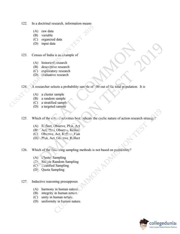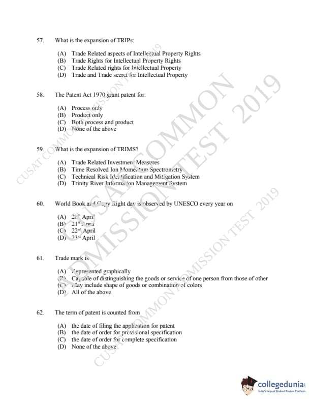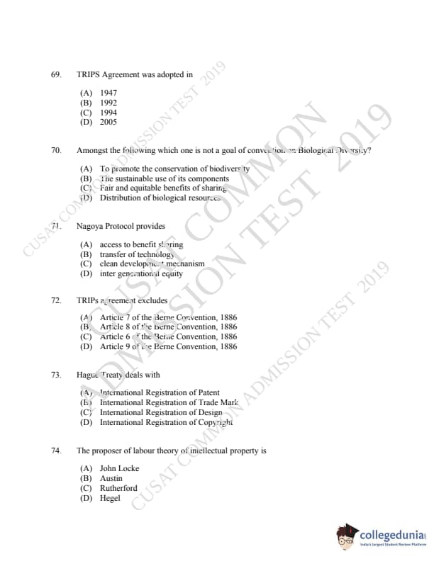 CUSAT CAT 2019 LLM IPR Ph.D Question Paper with Answer Key PDFs