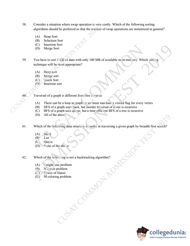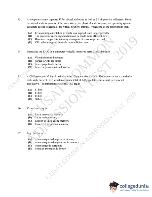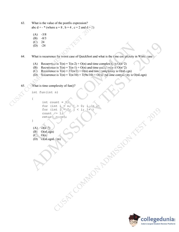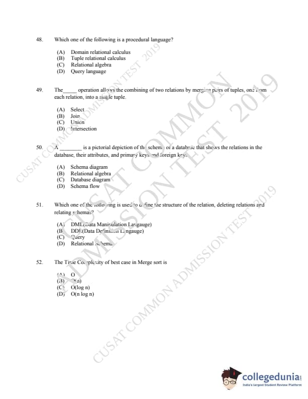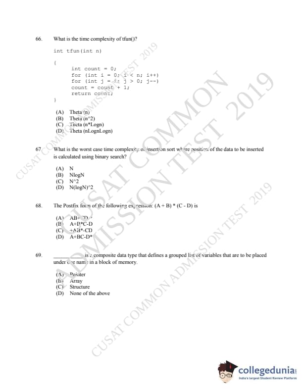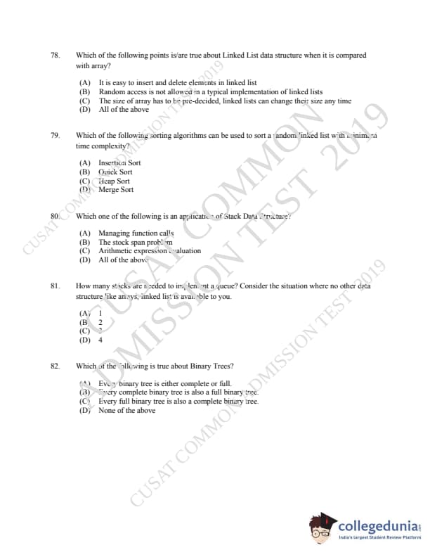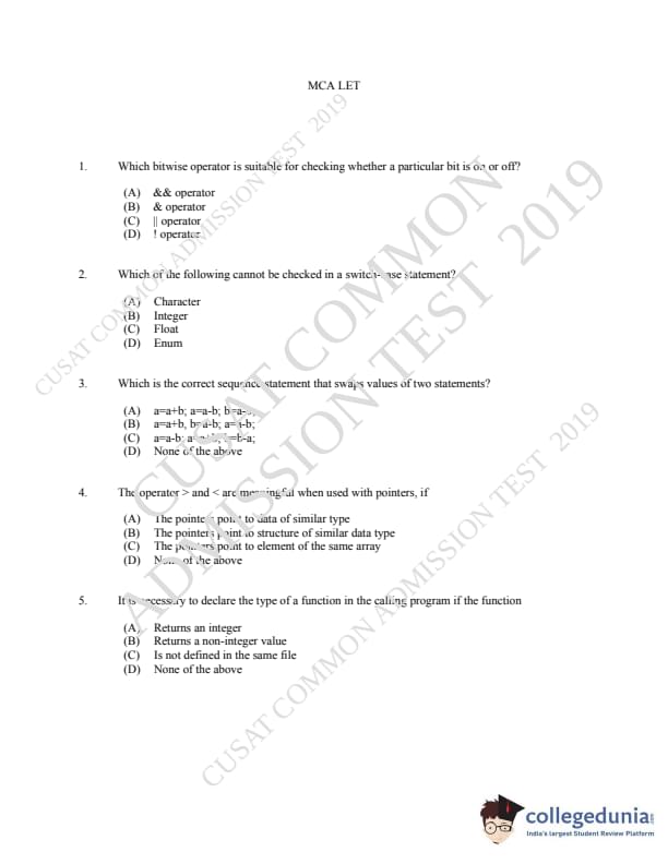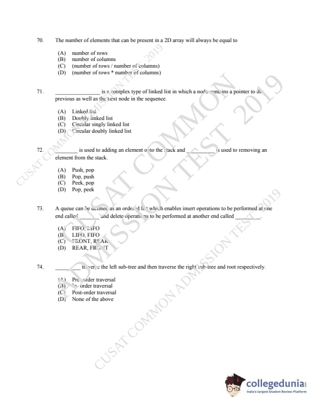 CUSAT CAT 2019 MCA LET Question paper with answer key pdf is available for download. The exam was successfully organized by Cochin University of Science & Technology. The question paper comprised a total of 150 questions.