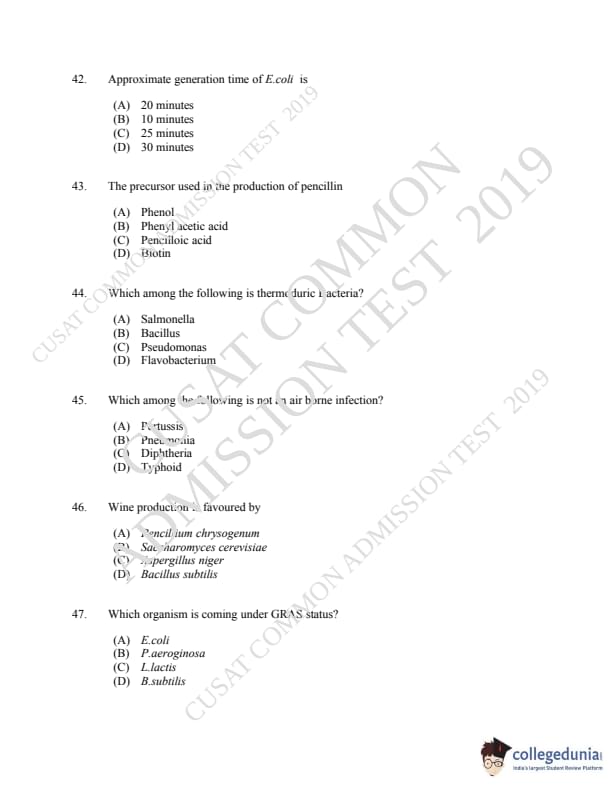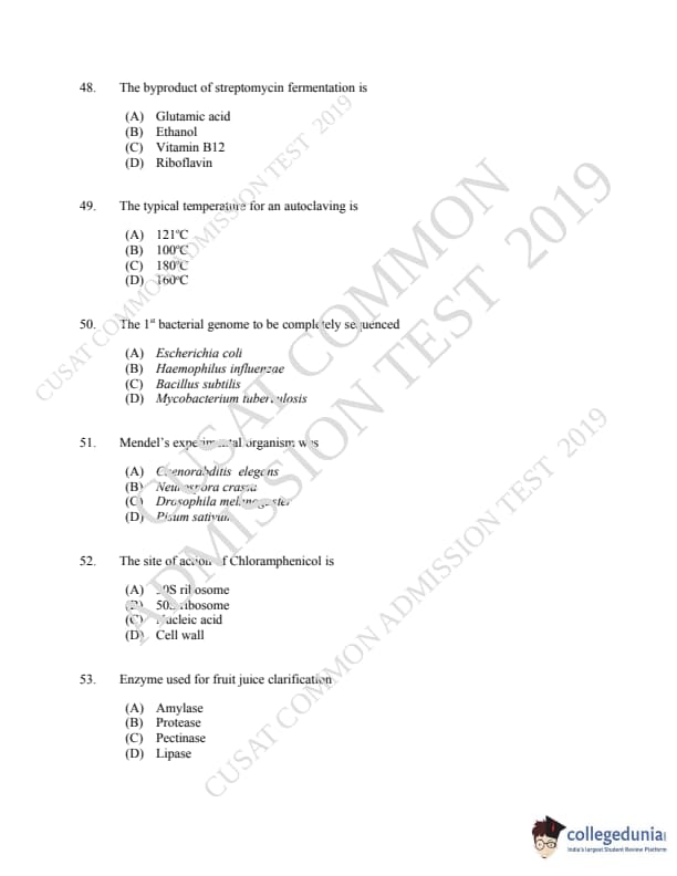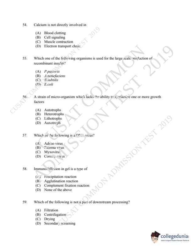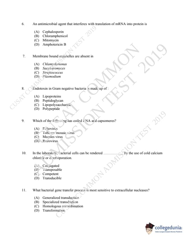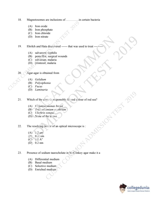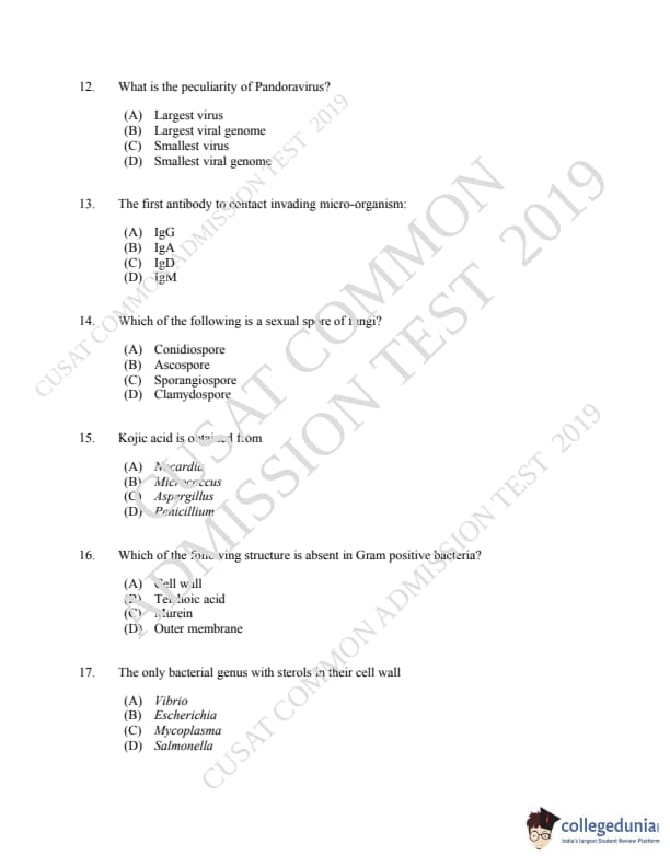 CUSAT CAT 2019 Microbiology Question Paper with Answer Key PDFs