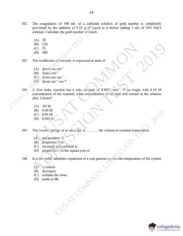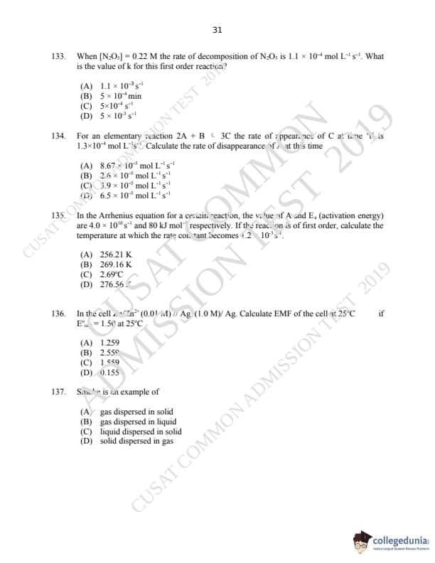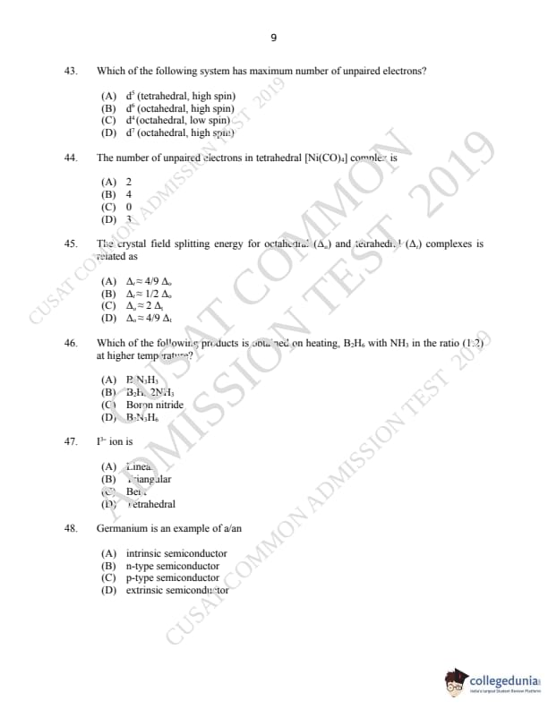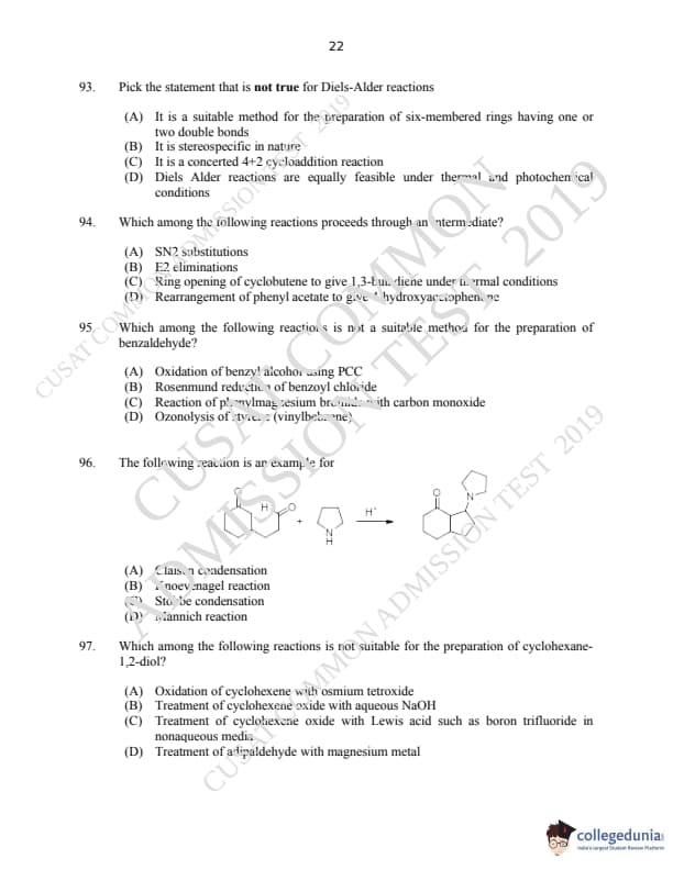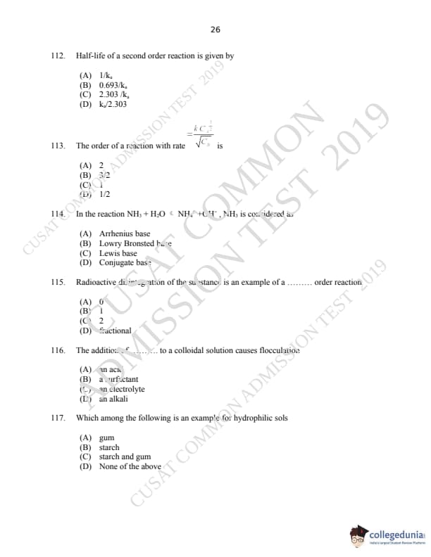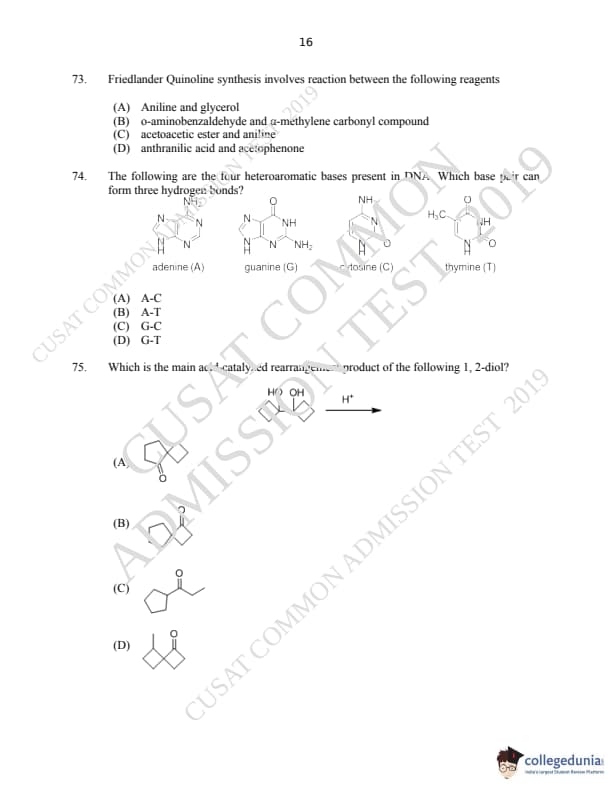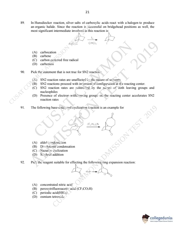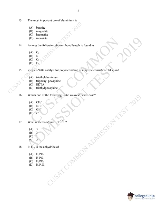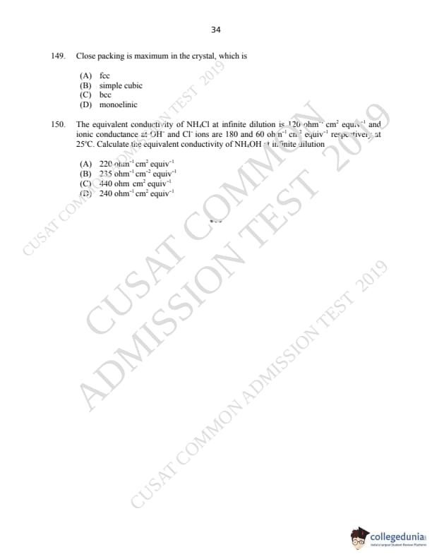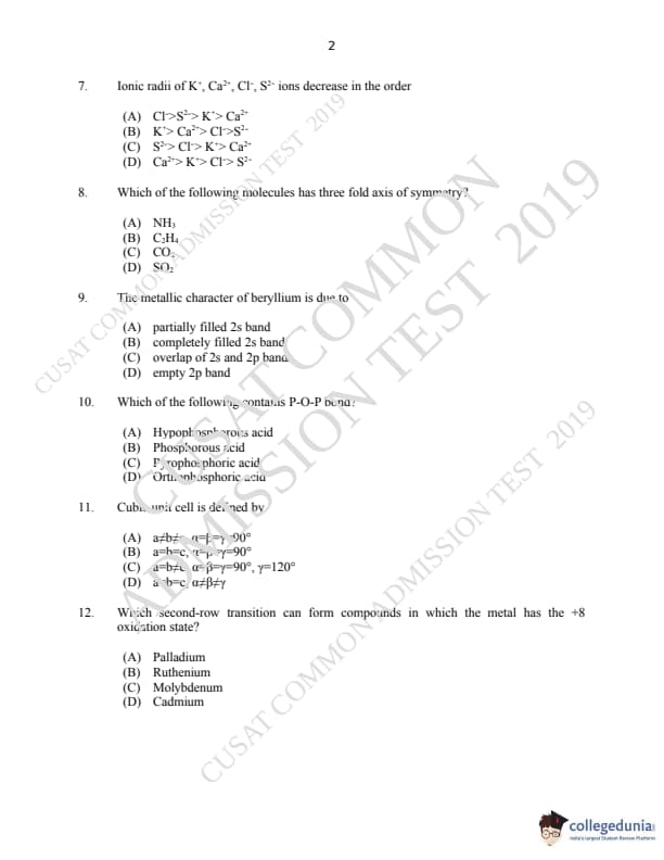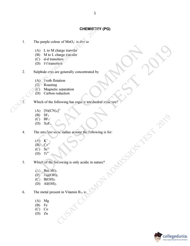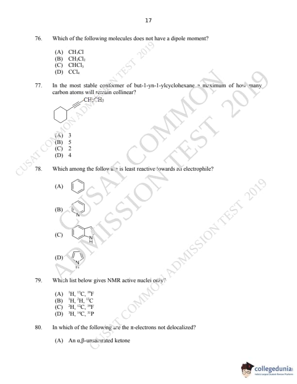 CUSAT CAT 2019 M.Sc Chemistry Question paper with answer key pdf is available for download. The exam was successfully organized by Cochin University of Science & Technology. The question paper comprised a total of 150 questions.