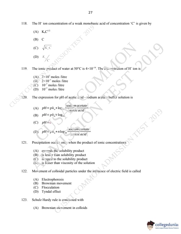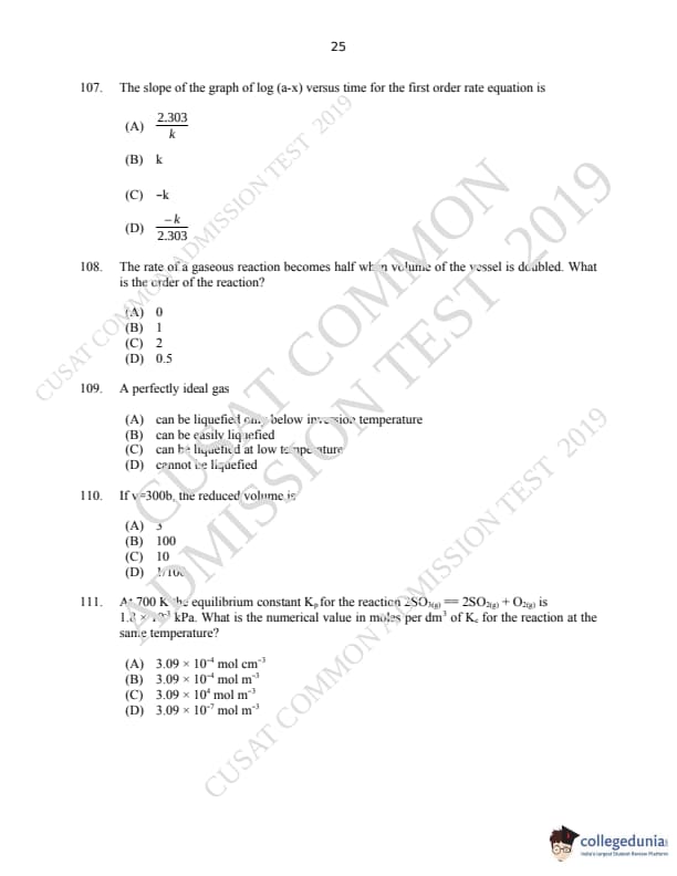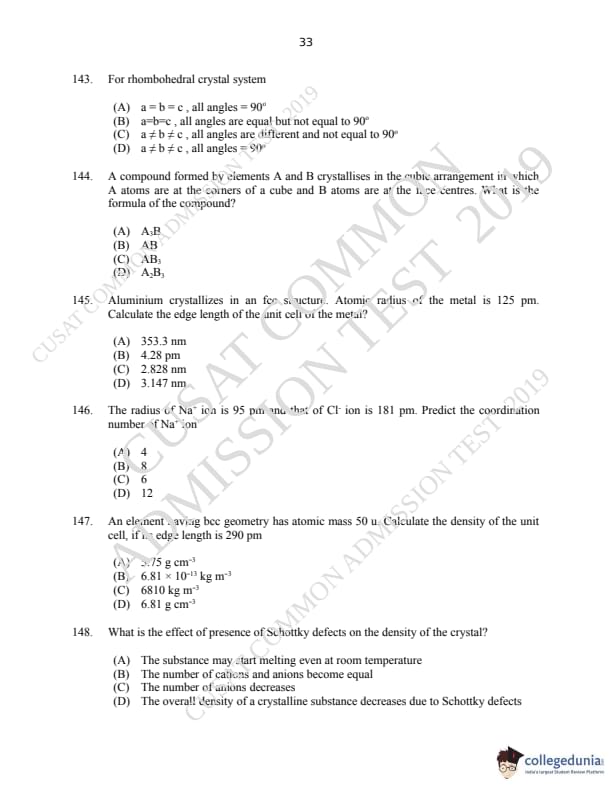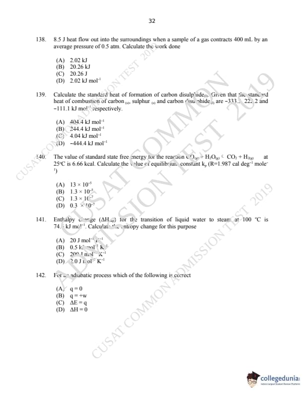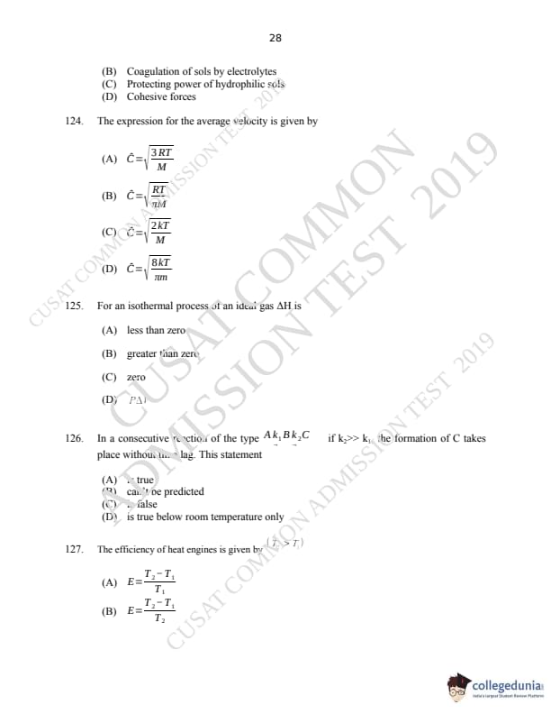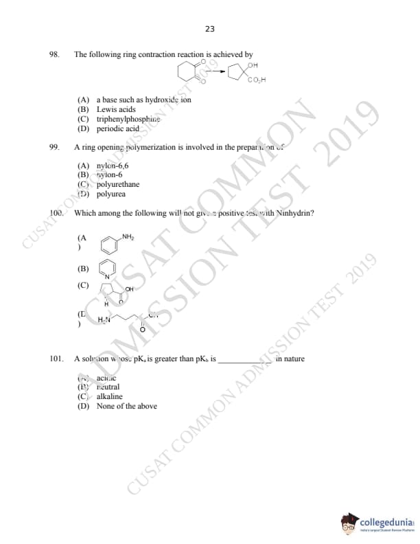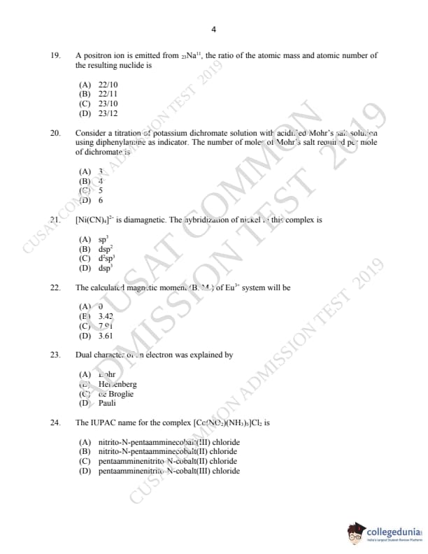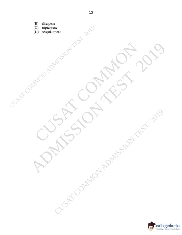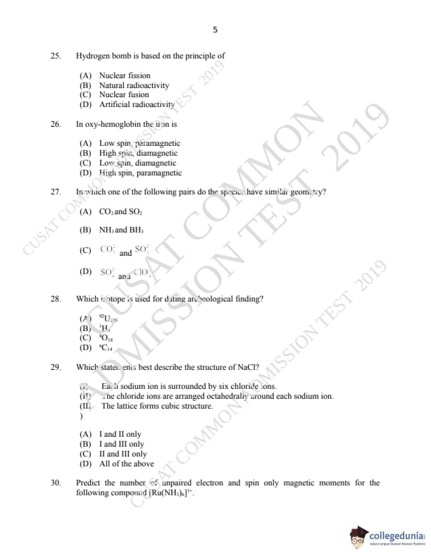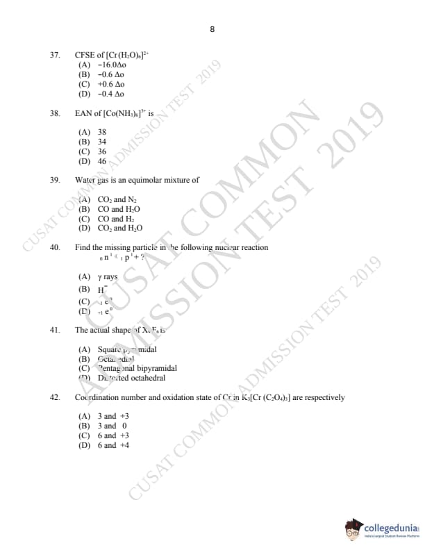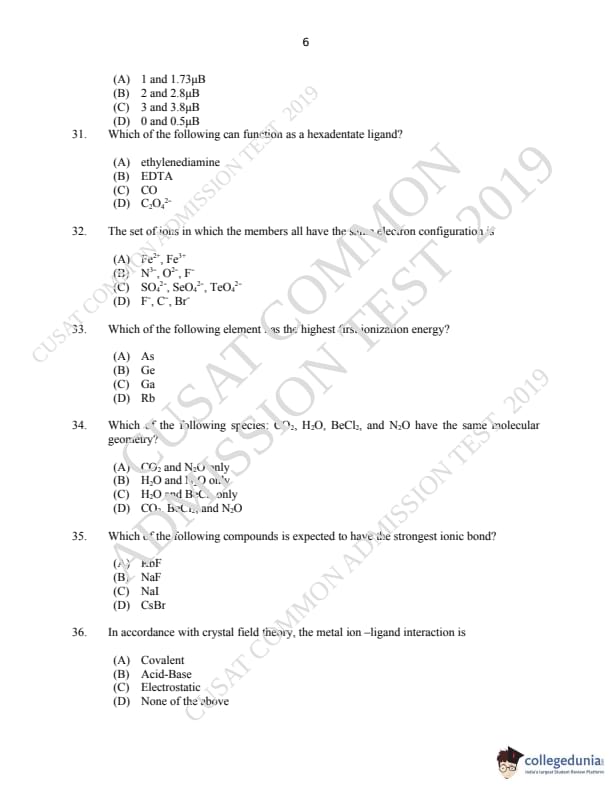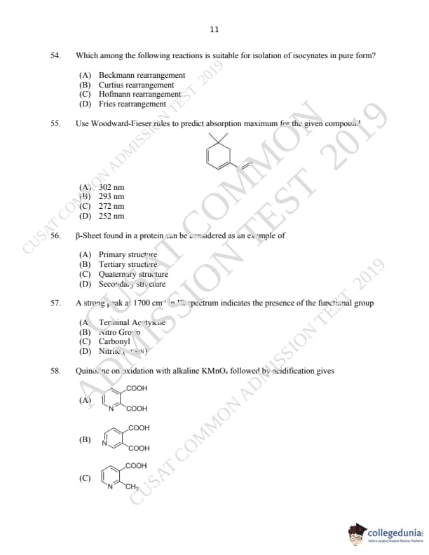 CUSAT CAT 2019 M.Sc Chemistry Question Paper with Answer Key PDFs