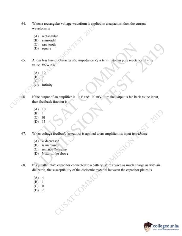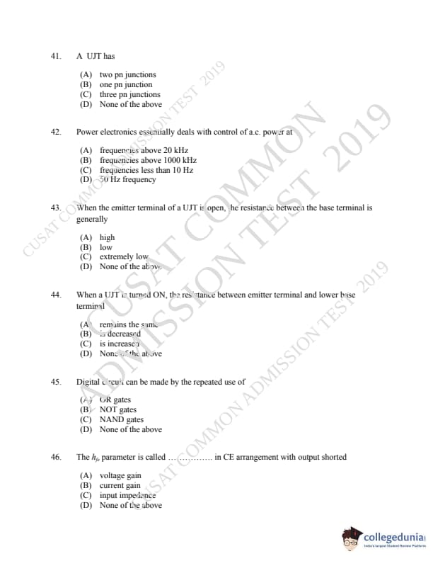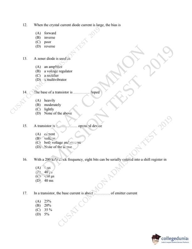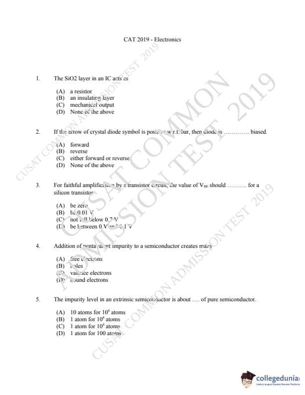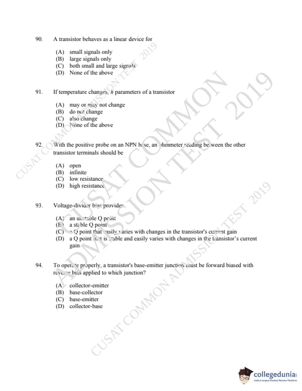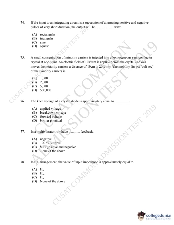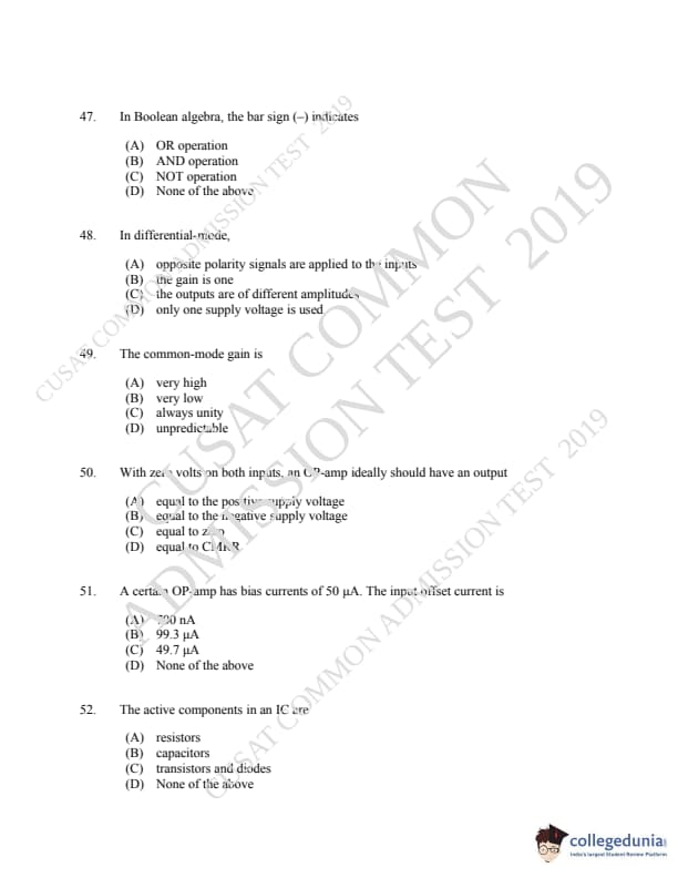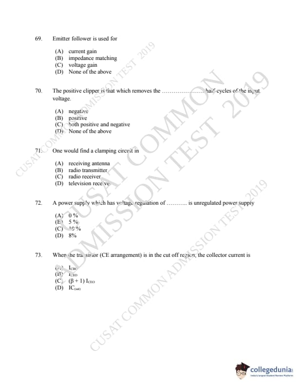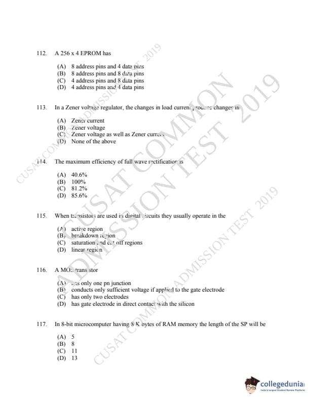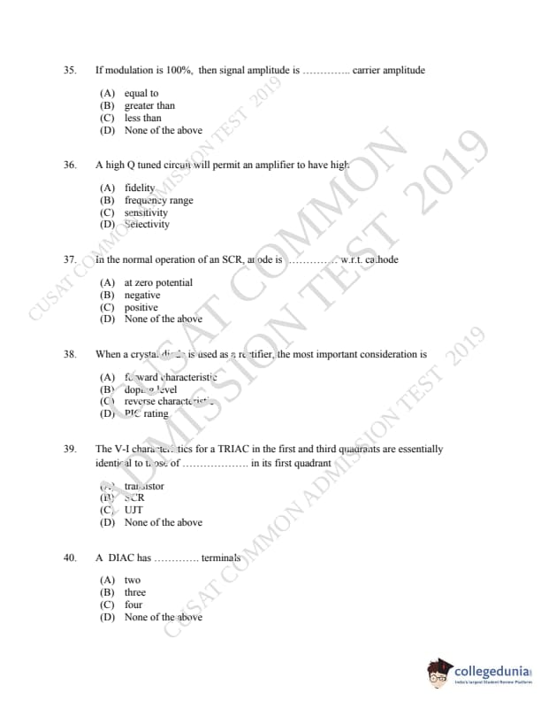 CUSAT CAT 2019 M.Sc Electronics Question paper with answer key pdf is available for download. The exam was successfully organized by Cochin University of Science & Technology. The question paper comprised a total of 150 questions.
