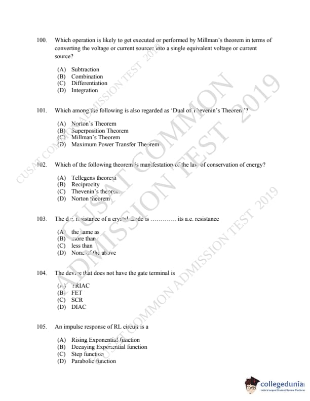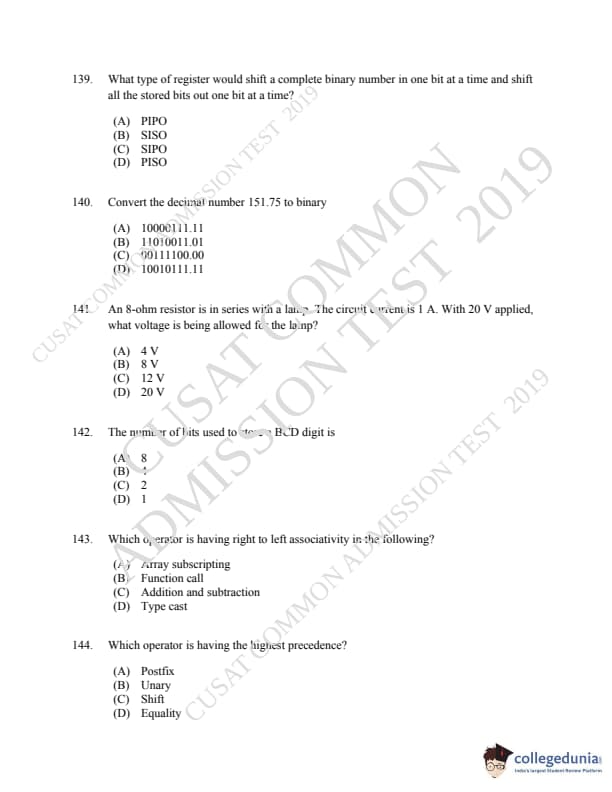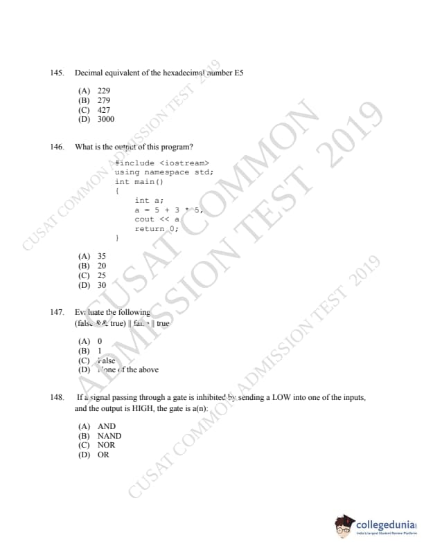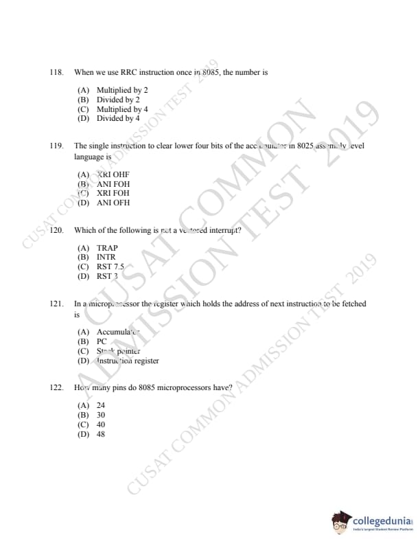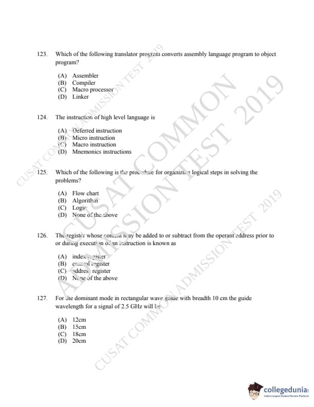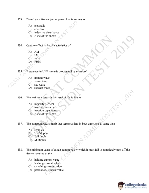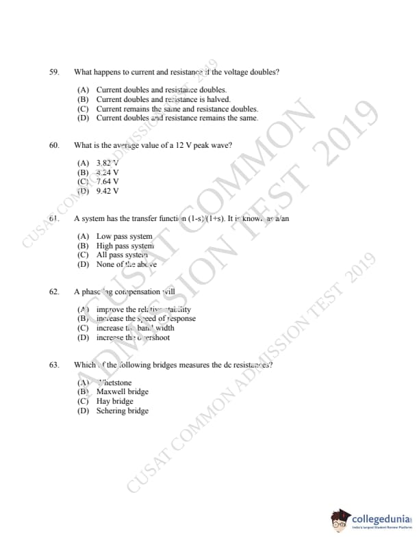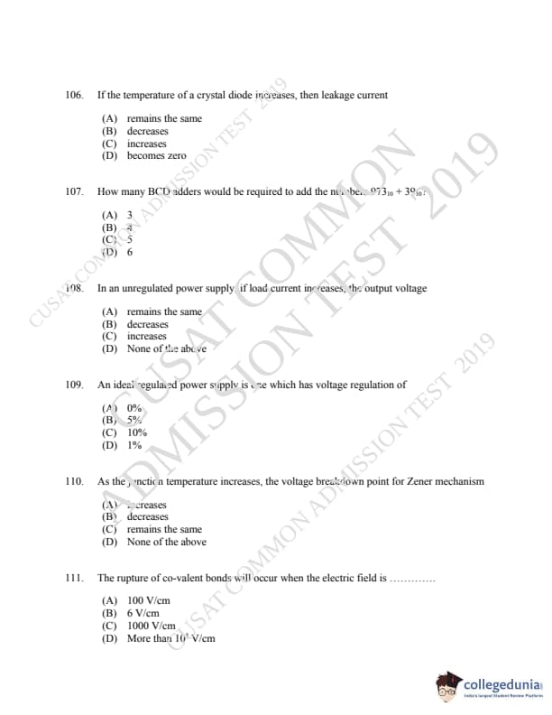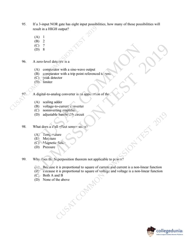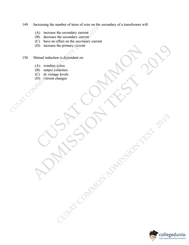 CUSAT CAT 2019 M.Sc Electronics Question paper with answer key pdf is available for download. The exam was successfully organized by Cochin University of Science & Technology. The question paper comprised a total of 150 questions.