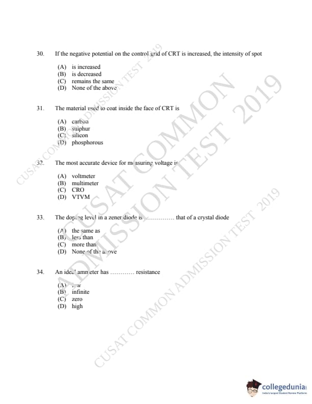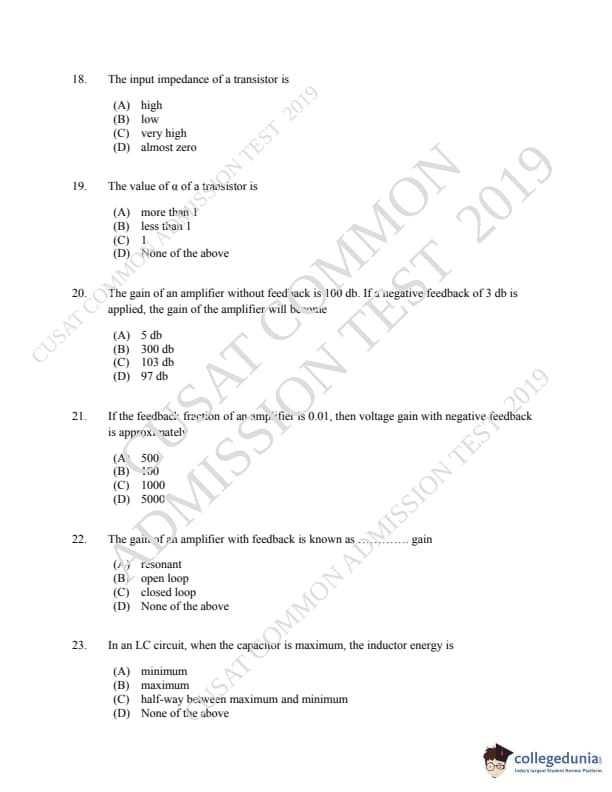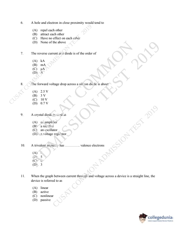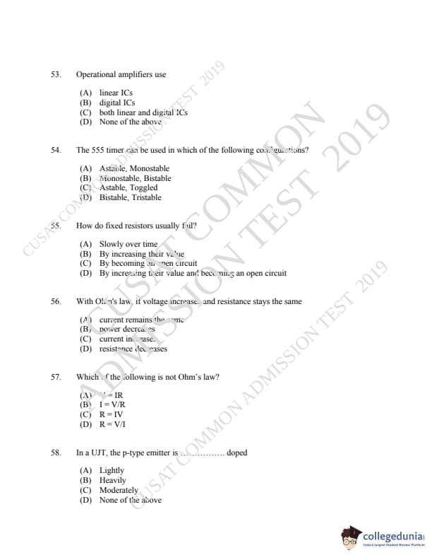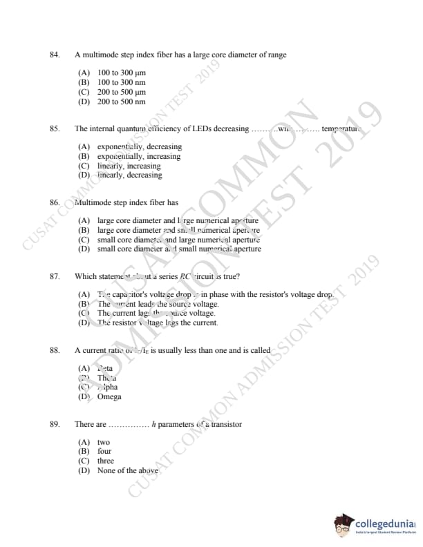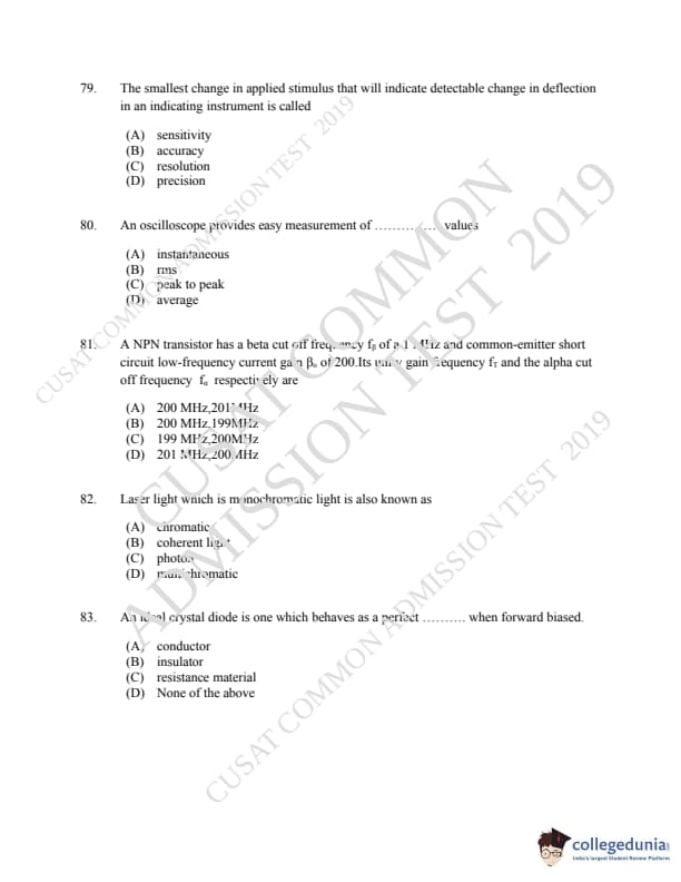 CUSAT CAT 2019 M.Sc Electronics Question Paper with Answer Key PDFs