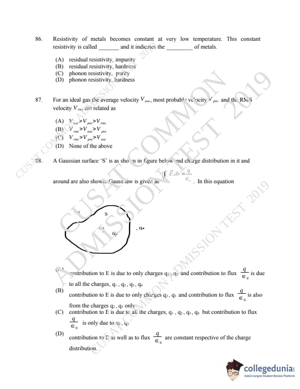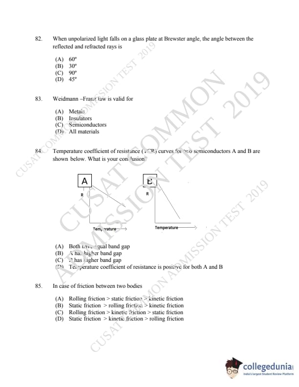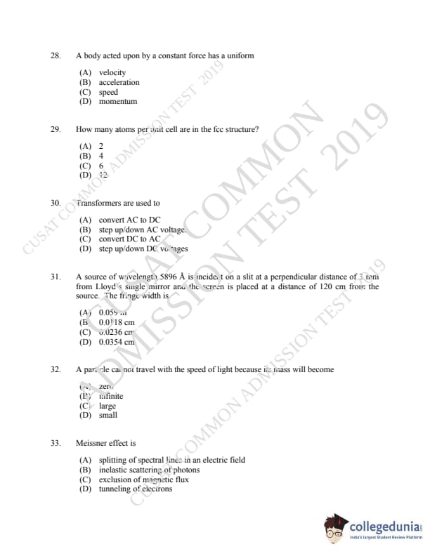 CUSAT CAT 2019 M.Sc Physics Question Paper with Answer Key PDFs