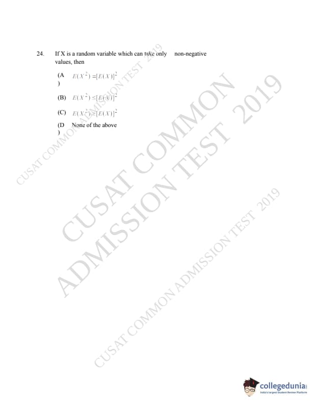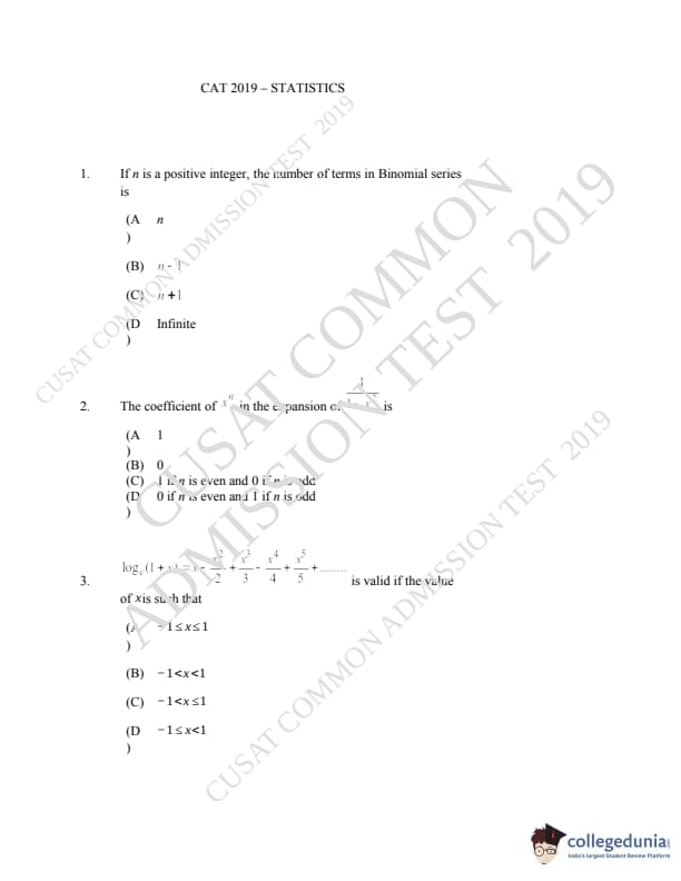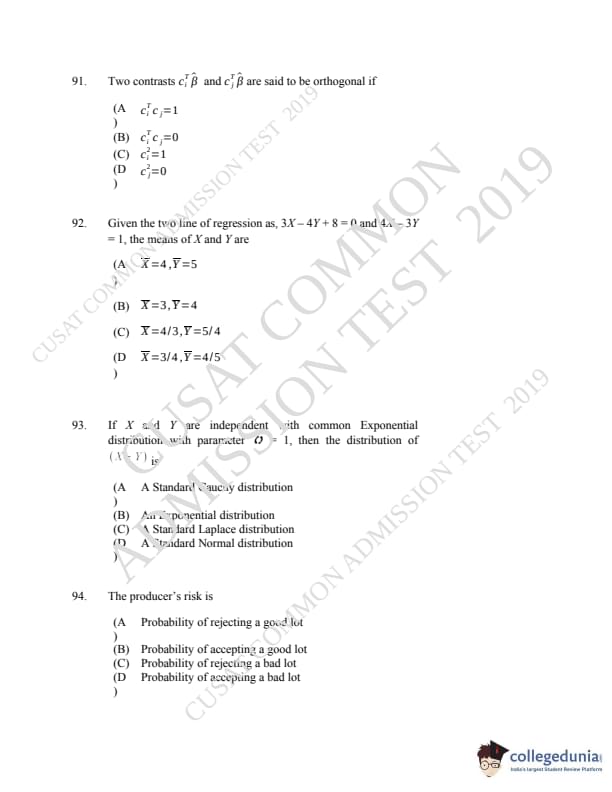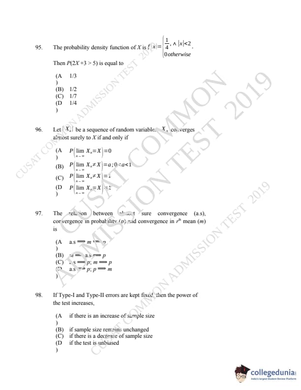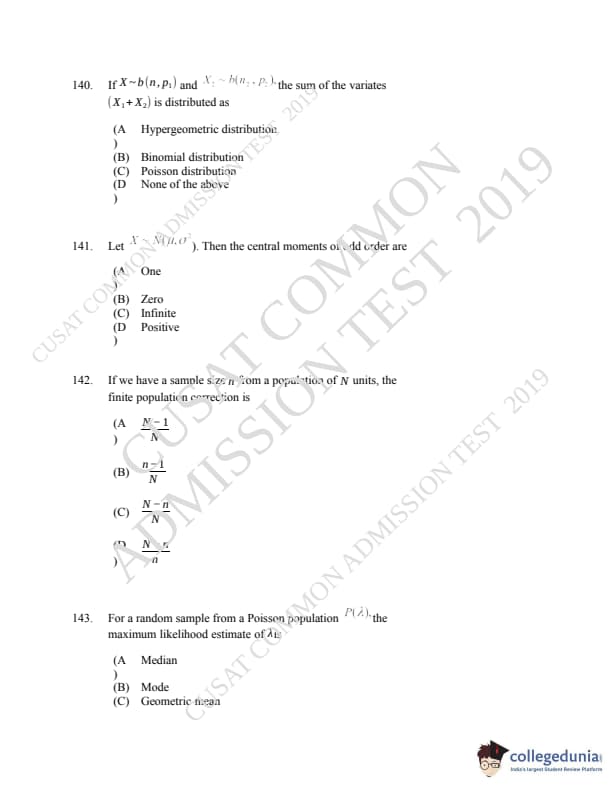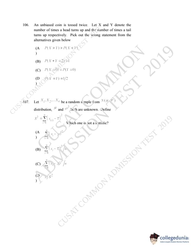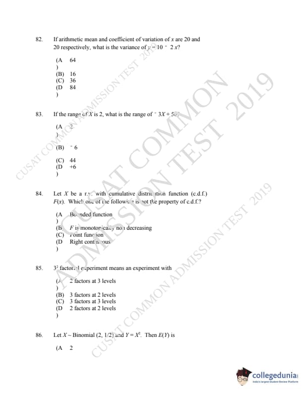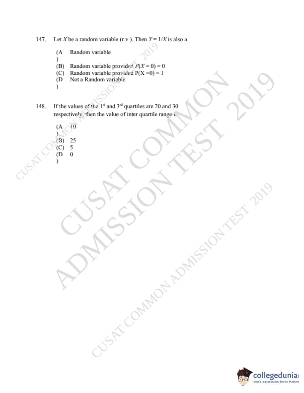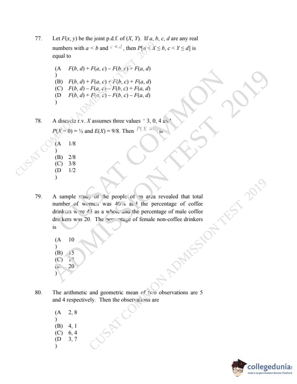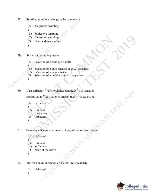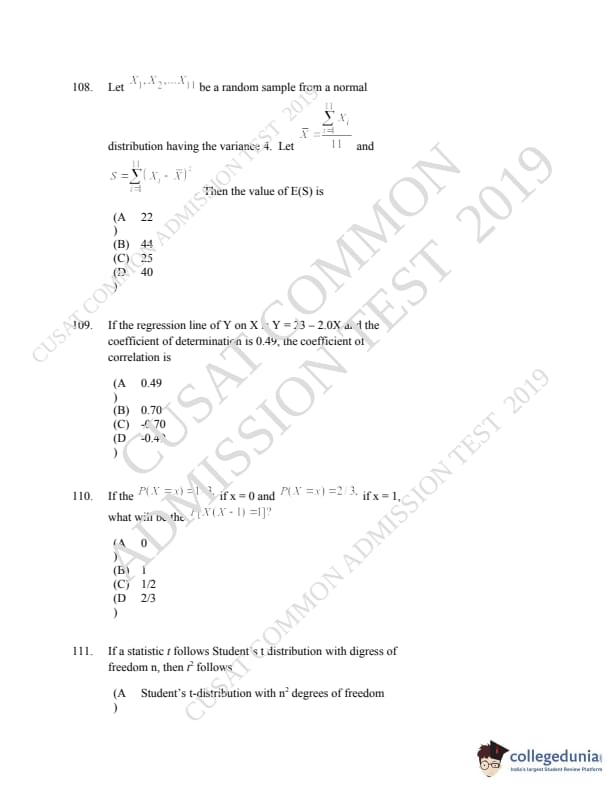 CUSAT CAT 2019 M.Sc Statistics Question Paper with Answer Key PDFs
