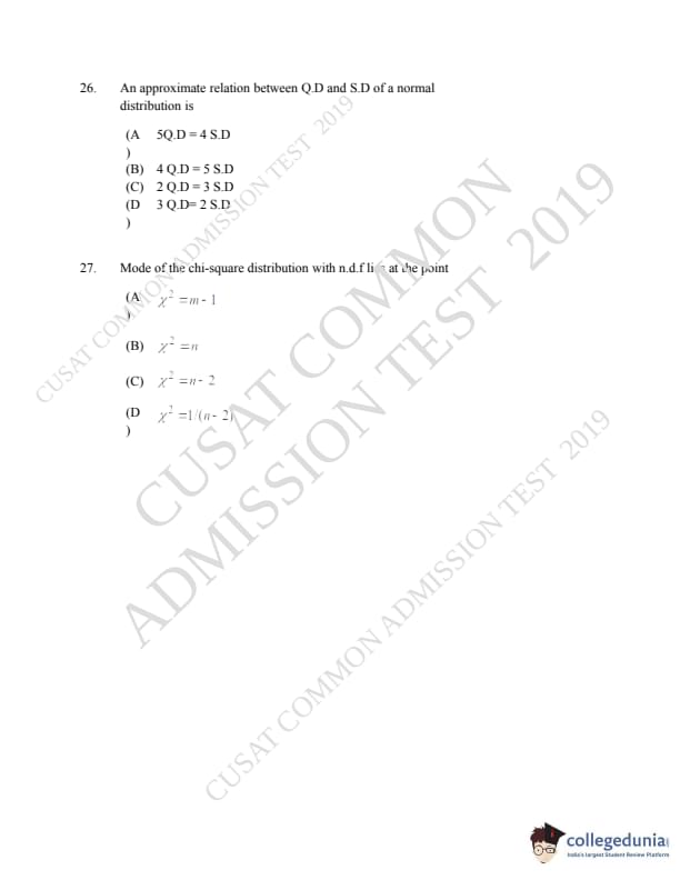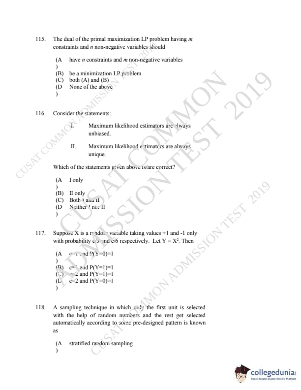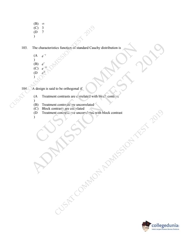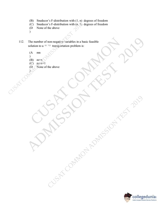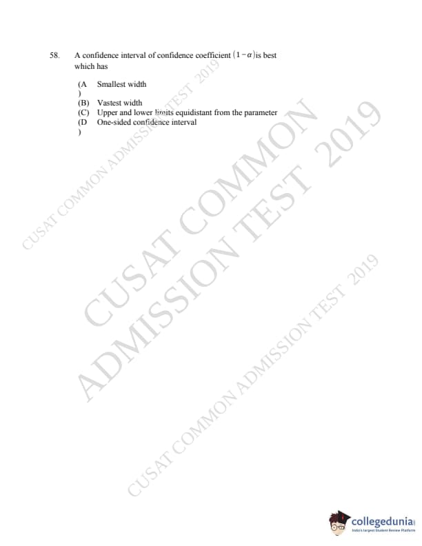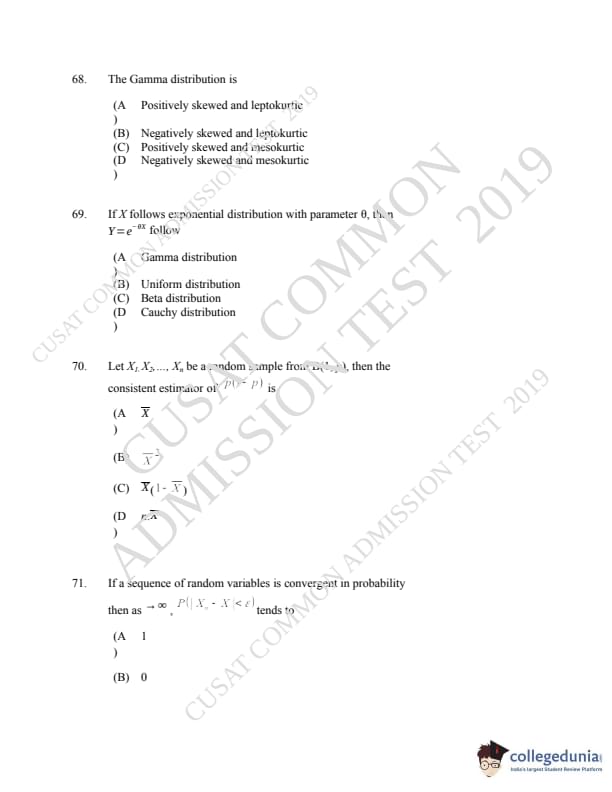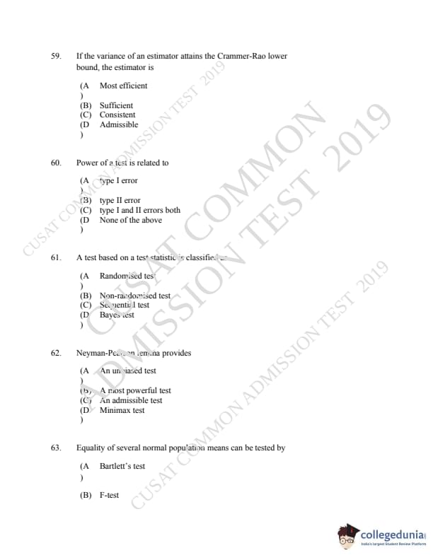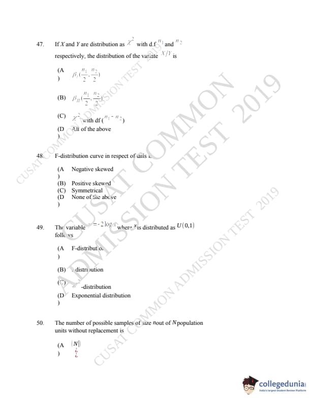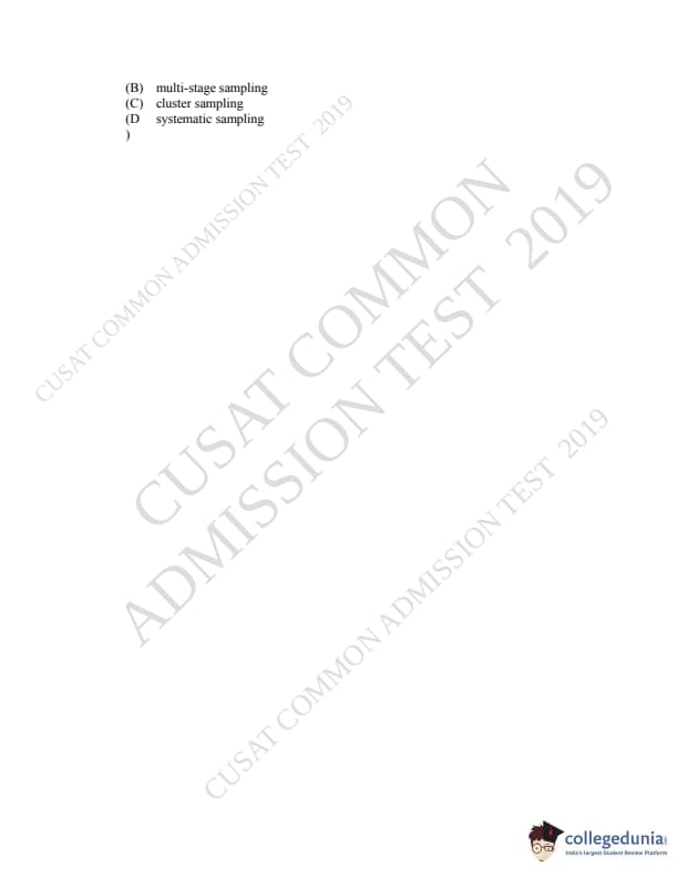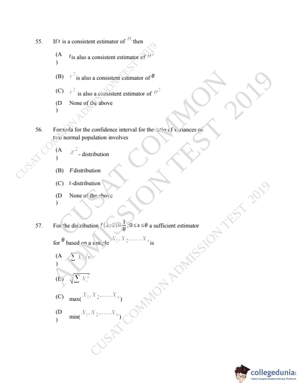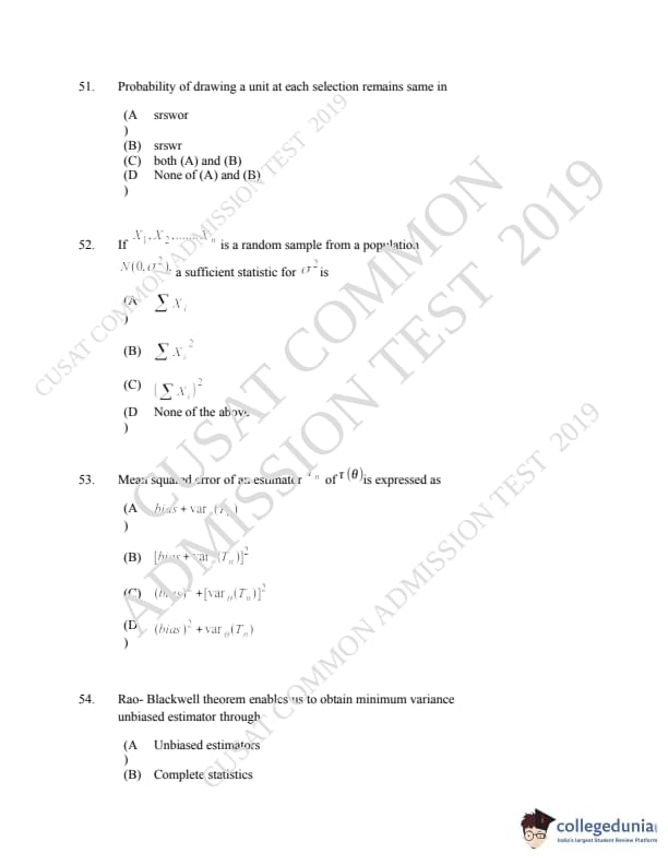 | CUSAT CAT 2019 M.Sc Statistics Question Paper PDF | CUSAT CAT 2019 M.Sc Statistics Answer Key PDF |