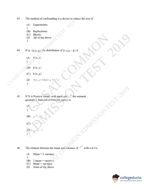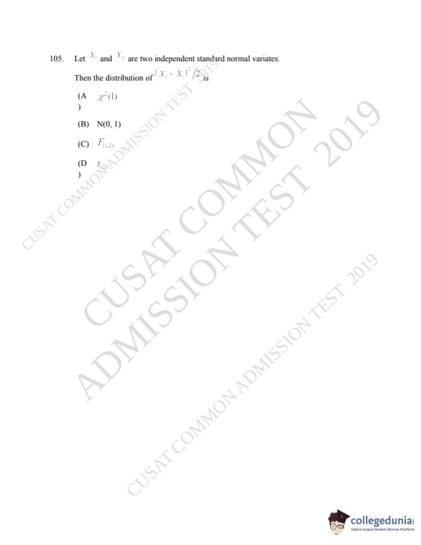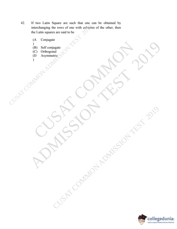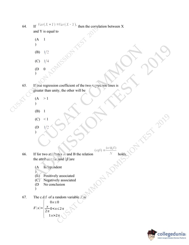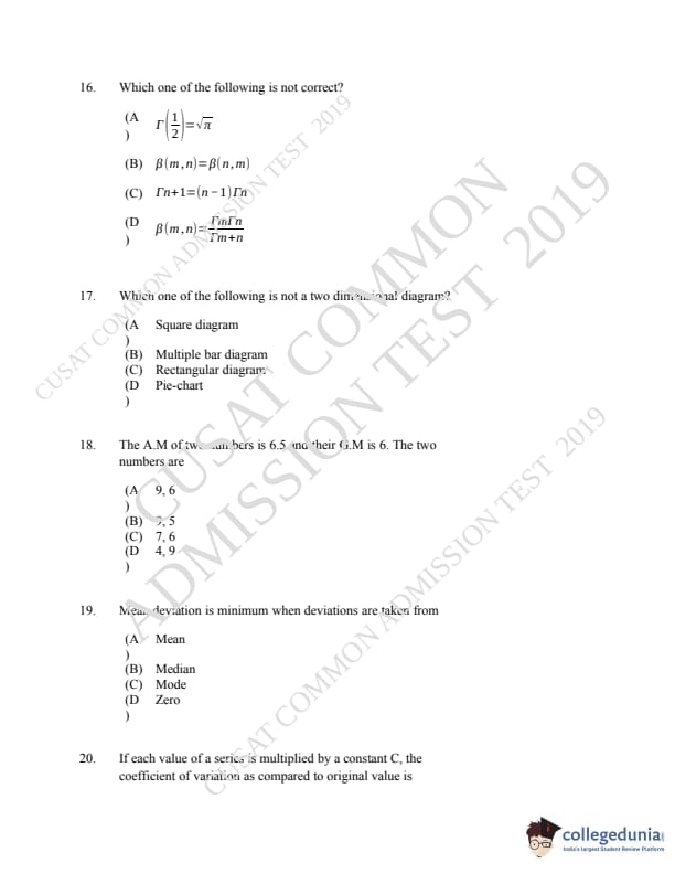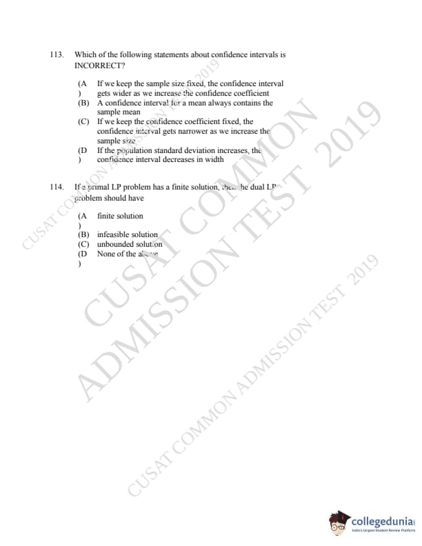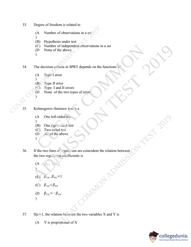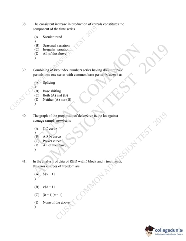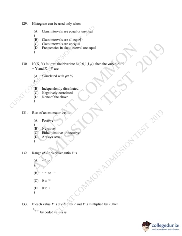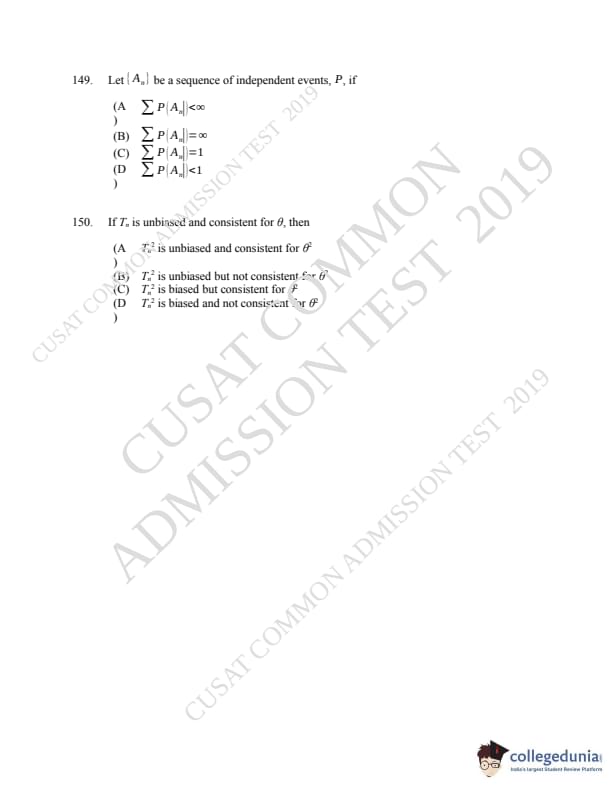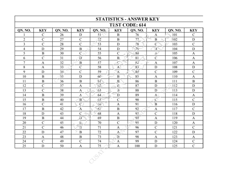 | CUSAT CAT 2019 M.Sc Statistics Question Paper PDF | CUSAT CAT 2019 M.Sc Statistics Answer Key PDF |