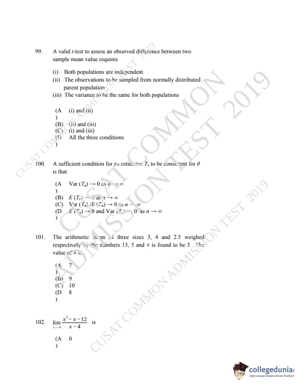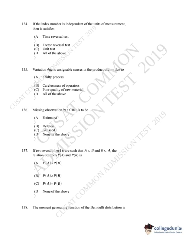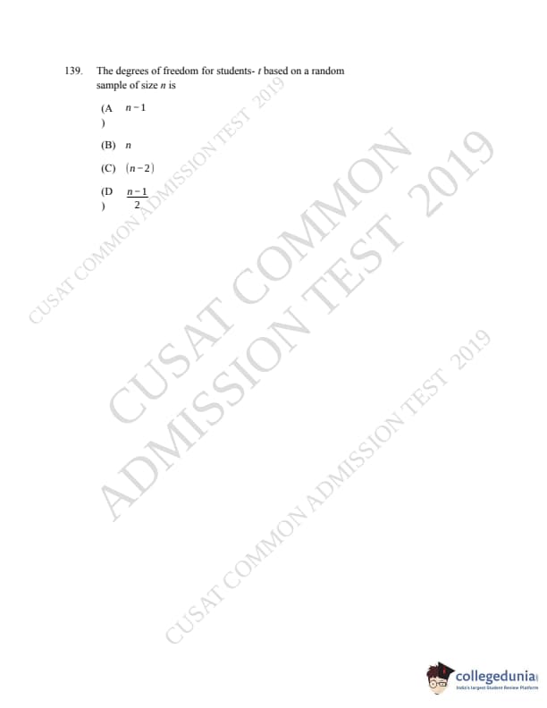 CUSAT CAT 2019 M.Sc Statistics Question paper with answer key pdf is available for download. The exam was successfully organized by Cochin University of Science & Technology. The question paper comprised a total of 150 questions.