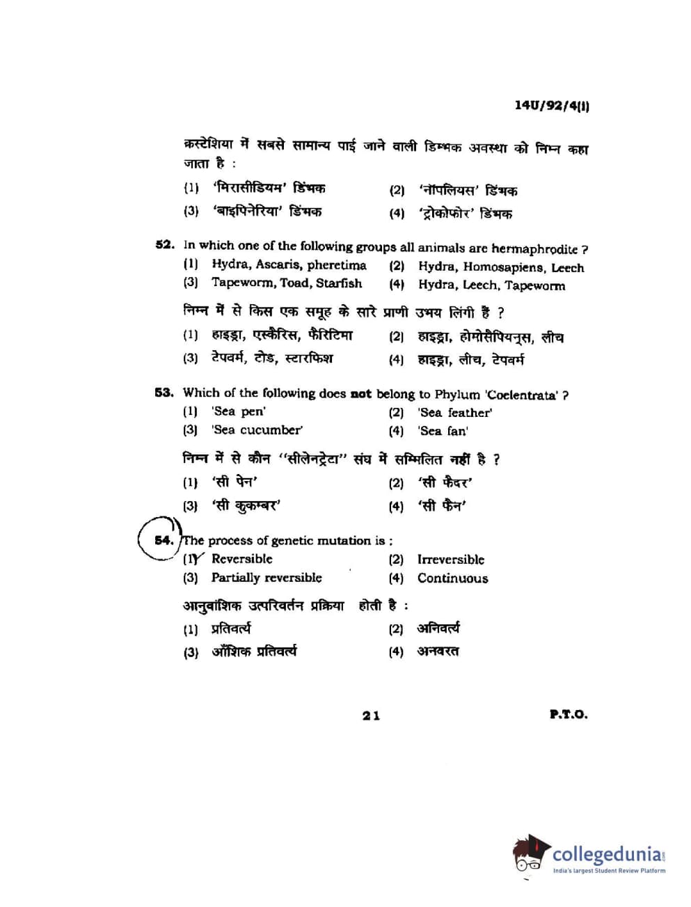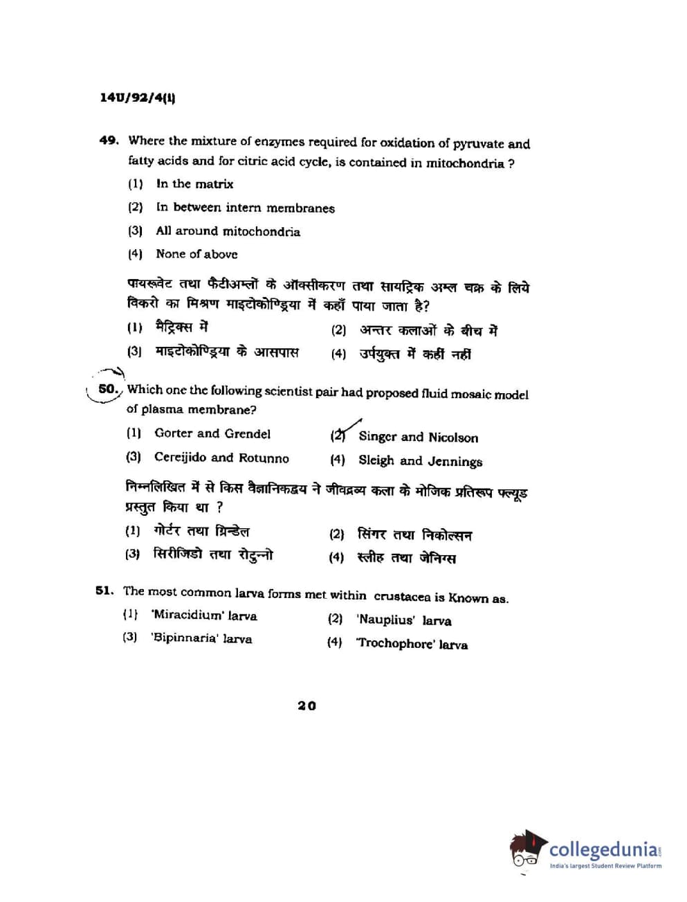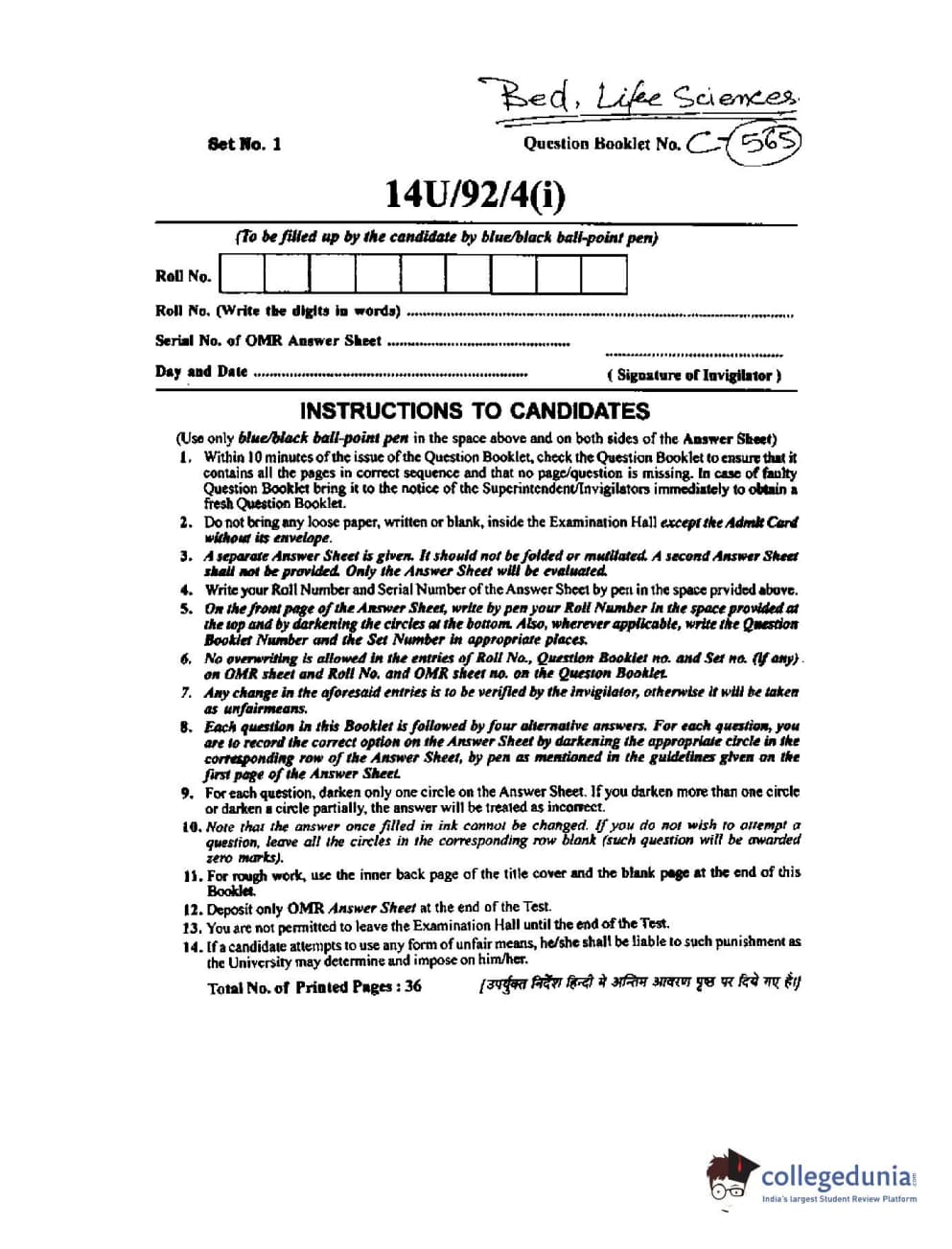 BHU UET 2014 B.Ed Life Science (Set-1) Question Paper with Answer Key PDFs