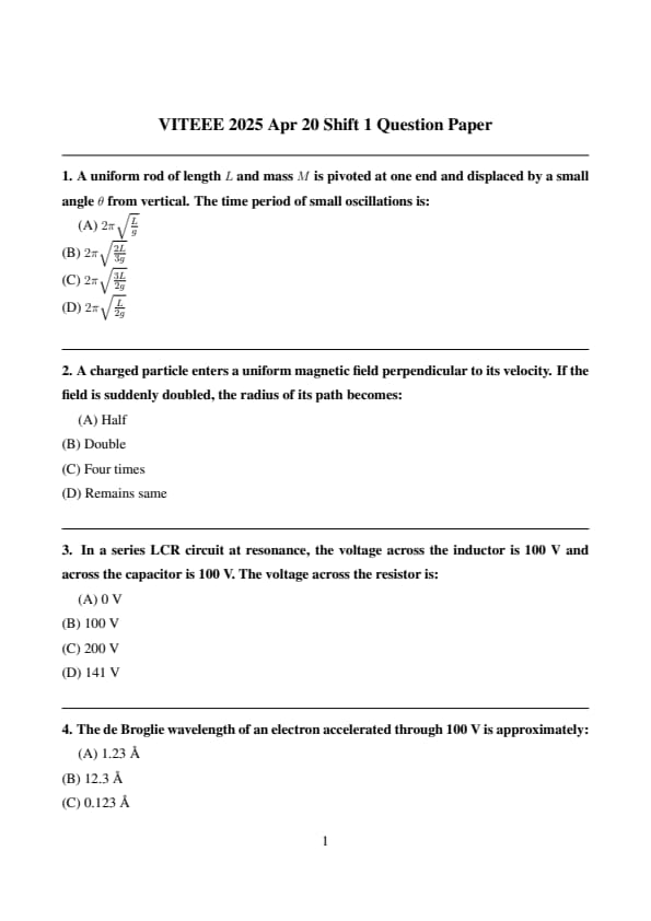 For a rod about one end: \(I=\frac{1}{3}ML^2,\; h=\frac{L}{2}\) \[ T=2\pi\sqrt{\frac{\frac{1}{3}ML^2}{Mg\frac{L}{2}}} =2\pi\sqrt{\frac{2L}{3g}} \] Quick Tip: Always use the physical pendulum formula when pivot is not at centre of mass.
