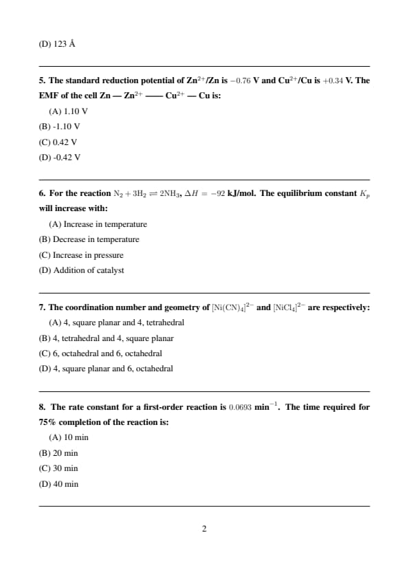 \[ E^\circ_{cell}=E^\circ_{cathode}-E^\circ_{anode} =0.34-(-0.76)=1.10\ V \] Quick Tip: Cell EMF = cathode potential − anode potential.