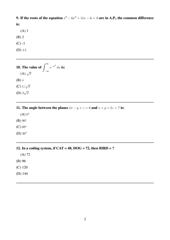 Normals: \(\vec{n_1}=(2,-1,1)\), \(\vec{n_2}=(1,1,2)\) \[ \cos\theta=\frac{\vec{n_1}\cdot\vec{n_2}}{|\vec{n_1}||\vec{n_2}|} =\frac{3}{\sqrt6\sqrt6}=\frac12 \Rightarrow \theta=60^\circ \] Quick Tip: Angle between planes equals angle between their normals.