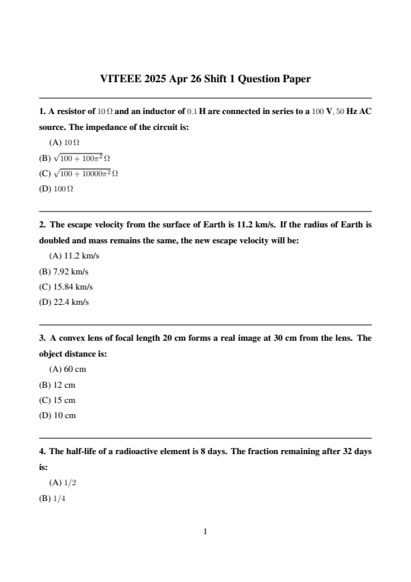 VITEEE 2025 26 April Shift 1 Question Paper is available here with solutions pdf. Vellore Institute of Technology is conducting VITEEE 2025 from April 20 to April 27. VITEEE 2025 Question Paper includes 40 questions from Mathematics/Biology, 35 questions from Physics, 35 questions from Chemistry, 5 questions from English, and 10 questions from Aptitude to be attempted in 150 minutes.