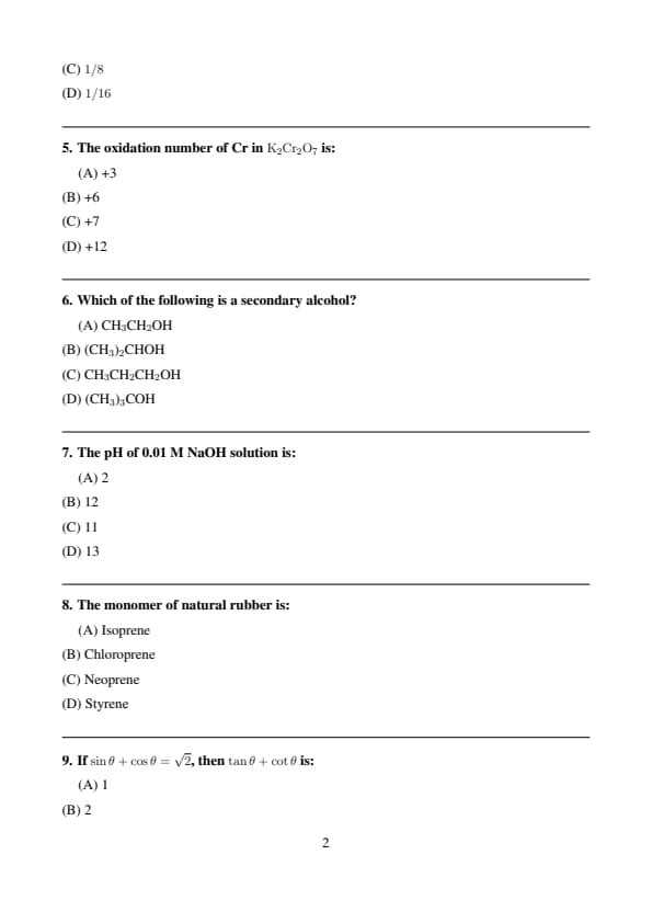 \[ \sin\theta=\cos\theta=\frac{1}{\sqrt{2}}\Rightarrow \theta=45^\circ \] \[ \tan\theta+\cot\theta=1+1=2 \] Quick Tip: Equality of sine and cosine implies \(45^\circ\).