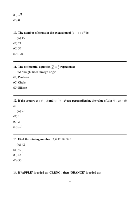 \[ Number of terms=\frac{(n+1)(n+2)}{2}=\frac{6\times7}{2}=21 \] Quick Tip: Applies to multinomial expansions.