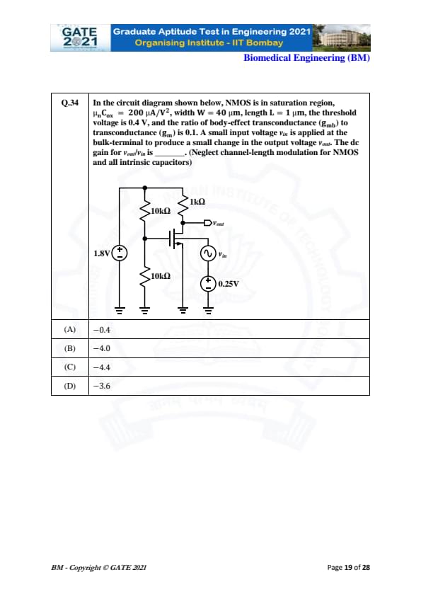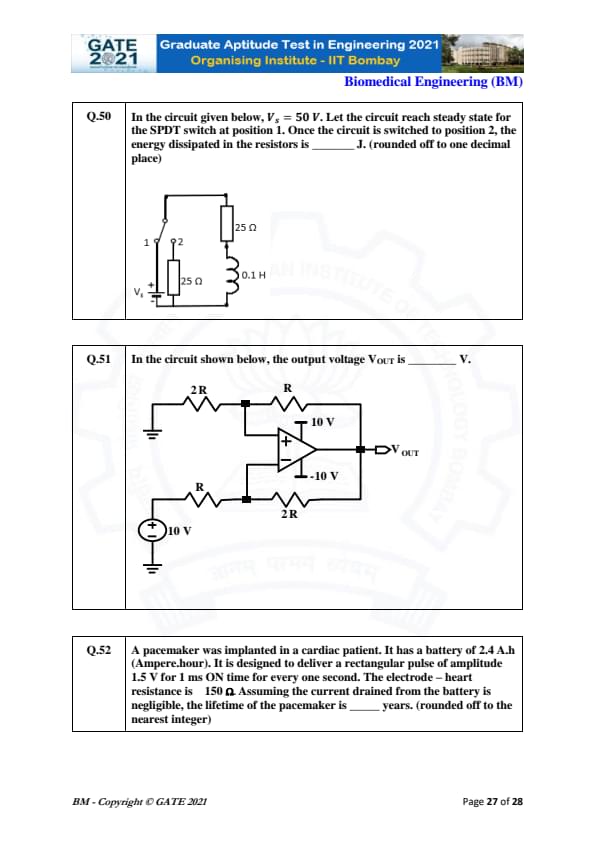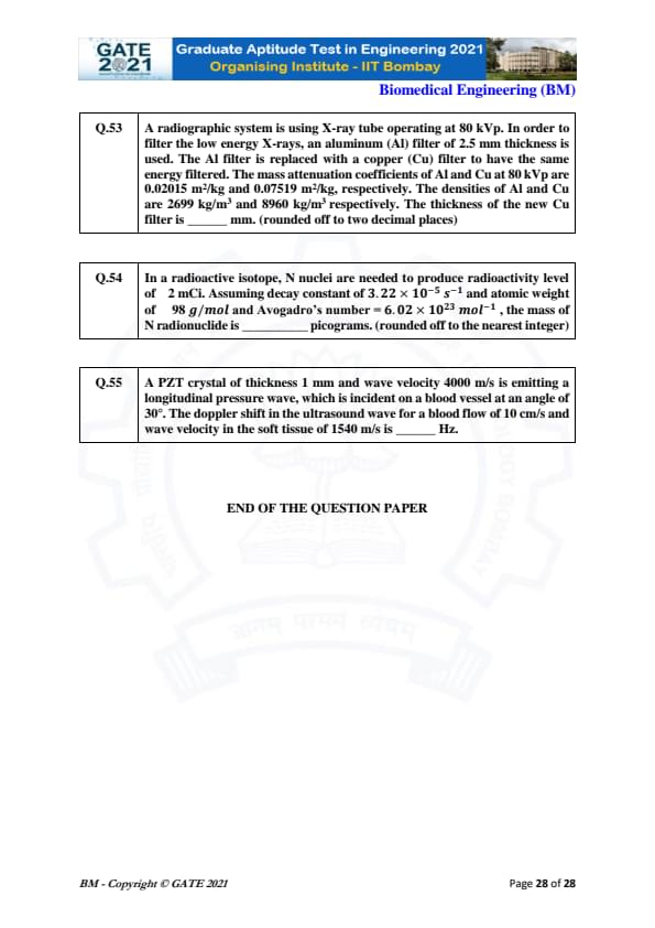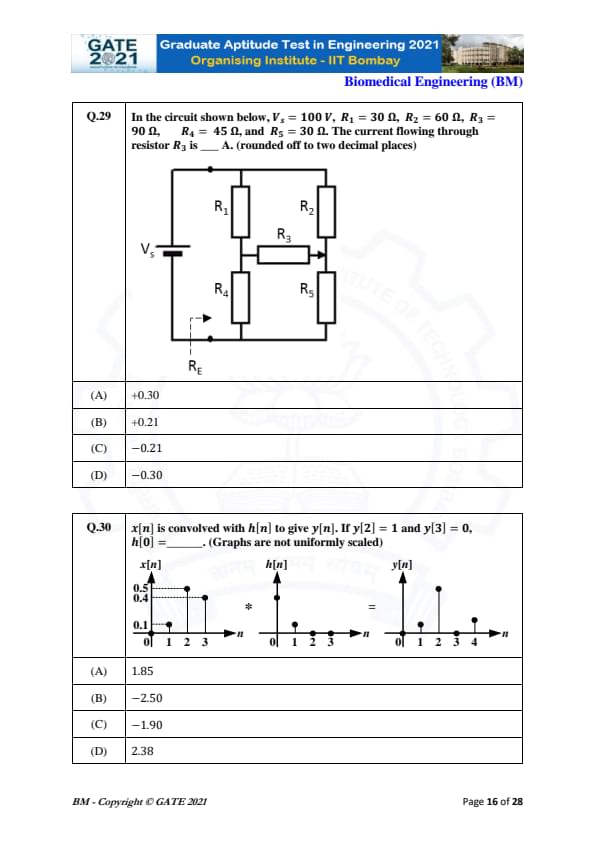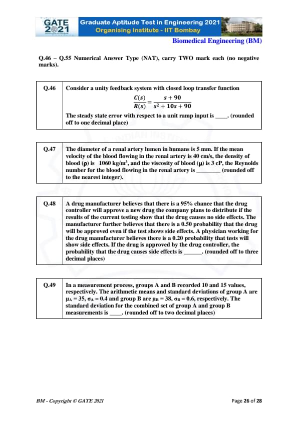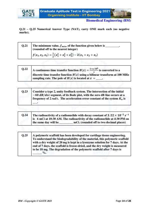 GATE 2021 Biomedical Engineering (BM) Question Paper with Solutions