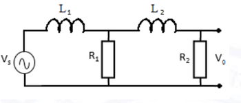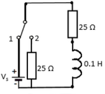 In steady state, the inductor behaves as a short circuit, so the total resistance is \(25\ \Omega + 25\ \Omega = 50\ \Omega\).