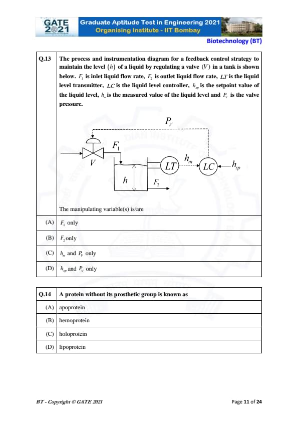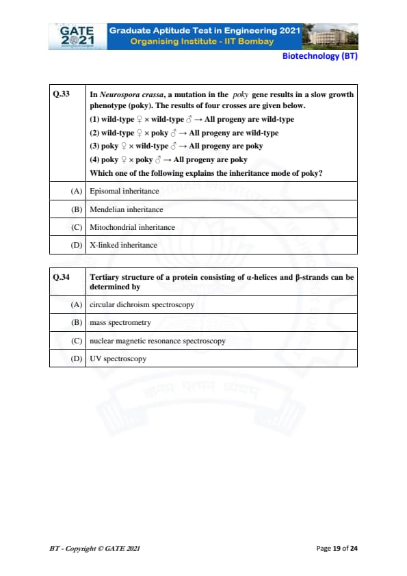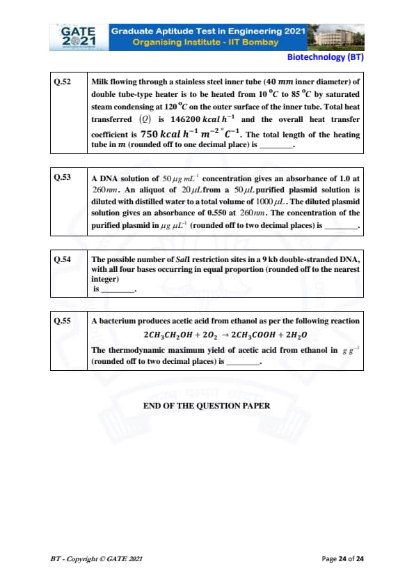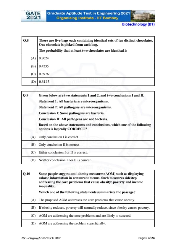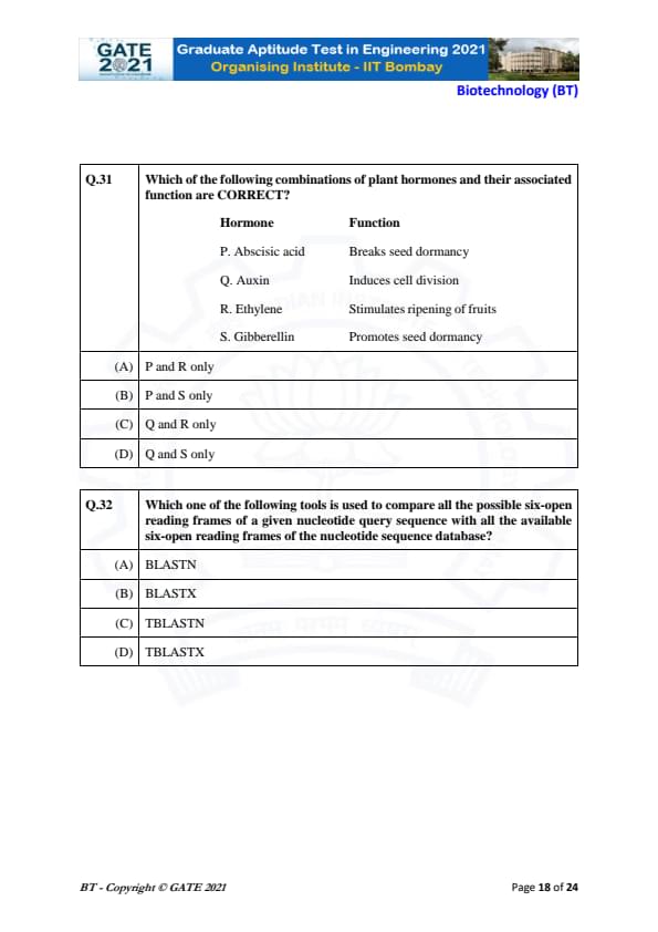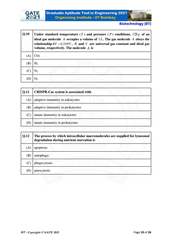 GATE 2021 BT Question Paper with Answer Key - Forenoon Session