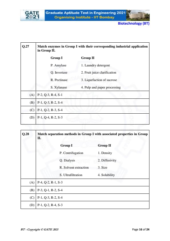 | 21 | Match enzymes in Group I with their corresponding industrial application in Group II: (P) Amylase (1) Laundry detergent (Q) Invertase (2) Fruit juice clarification (R) Pectinase (3) Liquefaction of sucrose (S) Xylanase (4) Pulp and paper processing | (B) P1, Q3, R2, S4 | Amylase is used in laundry detergent, invertase in sucrose liquefaction, pectinase in fruit juice clarification, and xylanase in pulp and paper processing. |