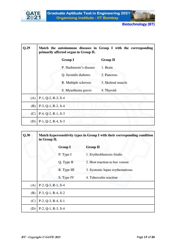 | 23 | Match autoimmune diseases in Group I with the corresponding primarily affected organ in Group II: (P) Hashimoto's disease (1) Brain (Q) Juvenile diabetes (2) Pancreas (R) Multiple sclerosis (3) Skeletal muscle (S) Myasthenia gravis (4) Thyroid | (C) P4, Q2, R1, S3 | Hashimoto's disease affects the thyroid, juvenile diabetes affects the pancreas, multiple sclerosis affects the brain, and myasthenia gravis affects skeletal muscles. |