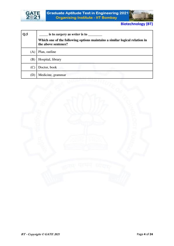 | 3 | Biotechnology (BT) is to surgery as writer is to: (A) Plan, outline (B) Hospital, library (C) Doctor, book (D) Medicine, grammar | (B) Hospital, library | The analogy compares fields or professions to the places or contexts they are most associated with."Biotechnology (BT) is to surgery" compares a field of study to its practical application.Similarly, "writer is to library" compares a profession to a place associated with writing.It follows the same logical relationship, both examples matching a profession or field to a space that holds an association with it. |