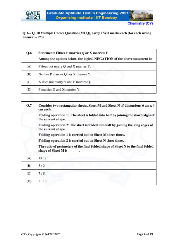 GATE 2021 CY: Exam Pattern and Marking Scheme
