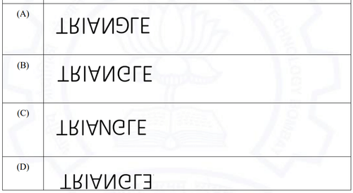 The mirror image of the word "TRIANGLE" about the x-axis is: \[ E L G N I A R T. \] Quick Tip: When reflecting text about the x-axis, the orientation of the letters changes, but the order remains the same. Only certain letters such as "R" and "G" change their shapes upon reflection.