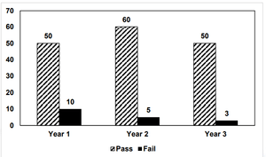 Year 3: Pass = 50, Fail = 3 → total = 53.