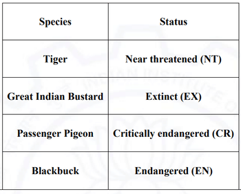 - Blackbuck: Blackbuck is listed as Endangered (EN) due to habitat loss and hunting. This is a conservation priority in India. Hence, (D) is incorrect for this species.