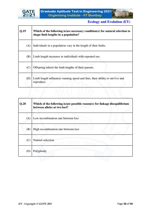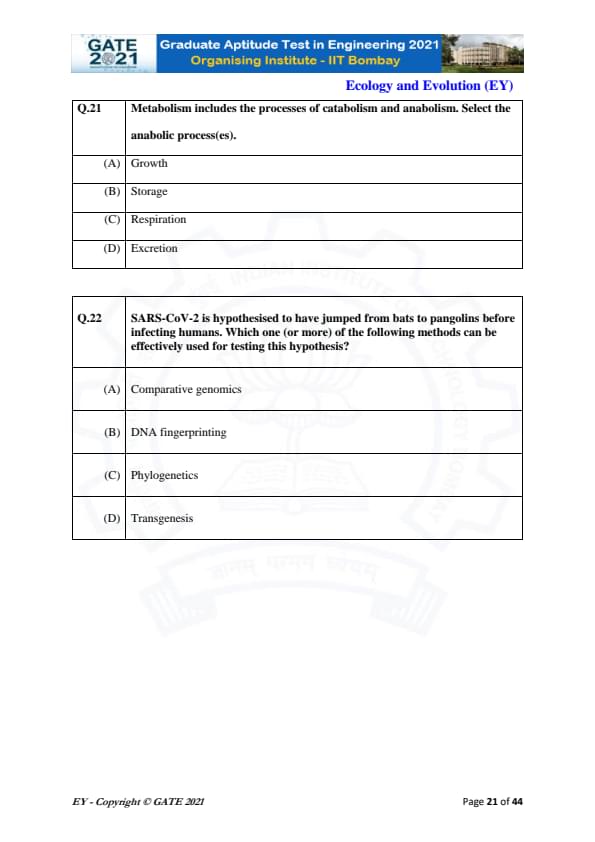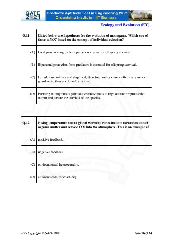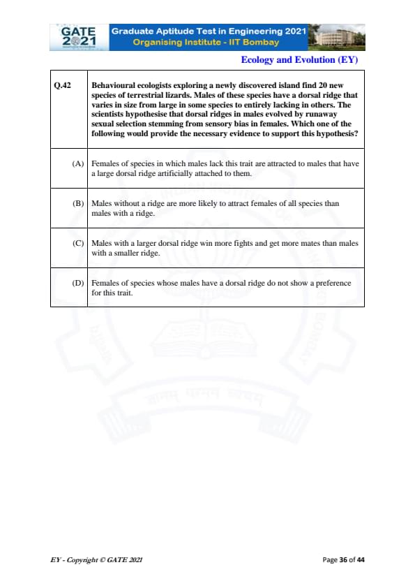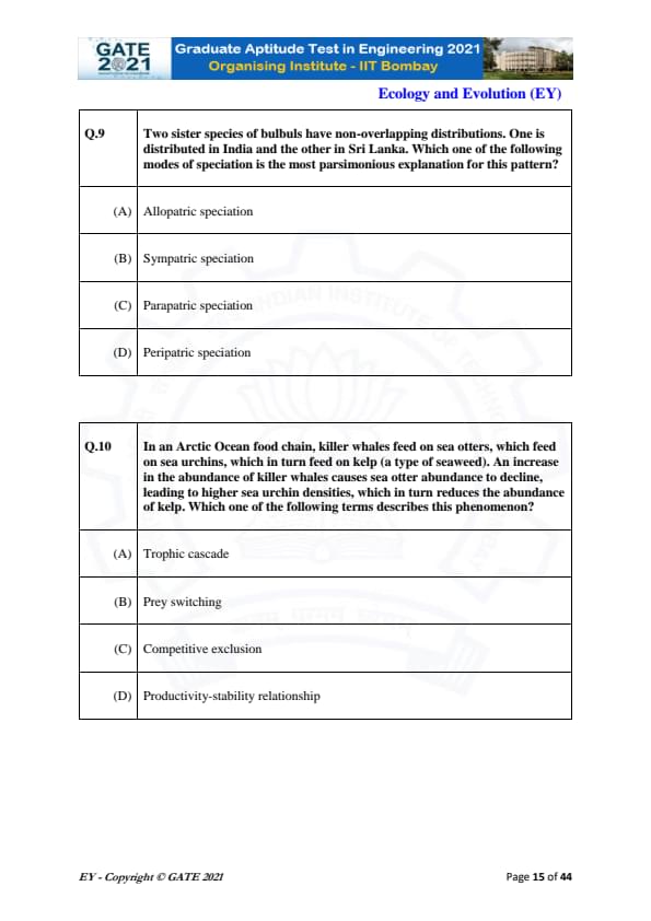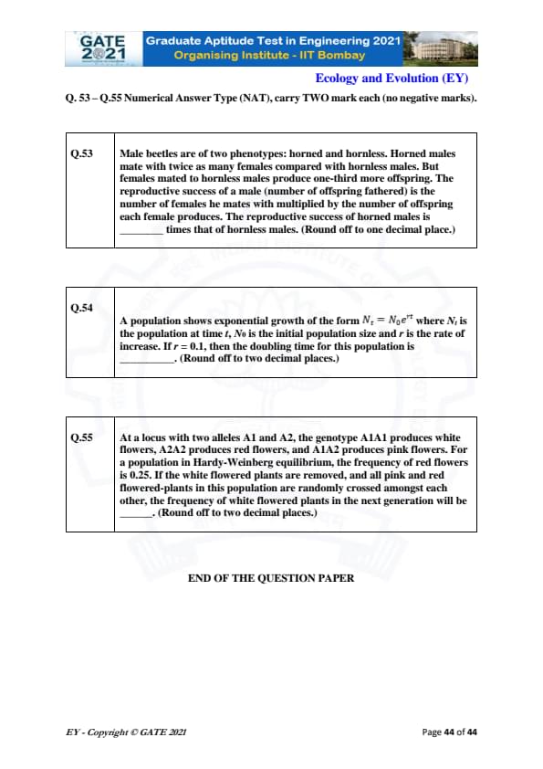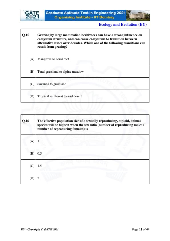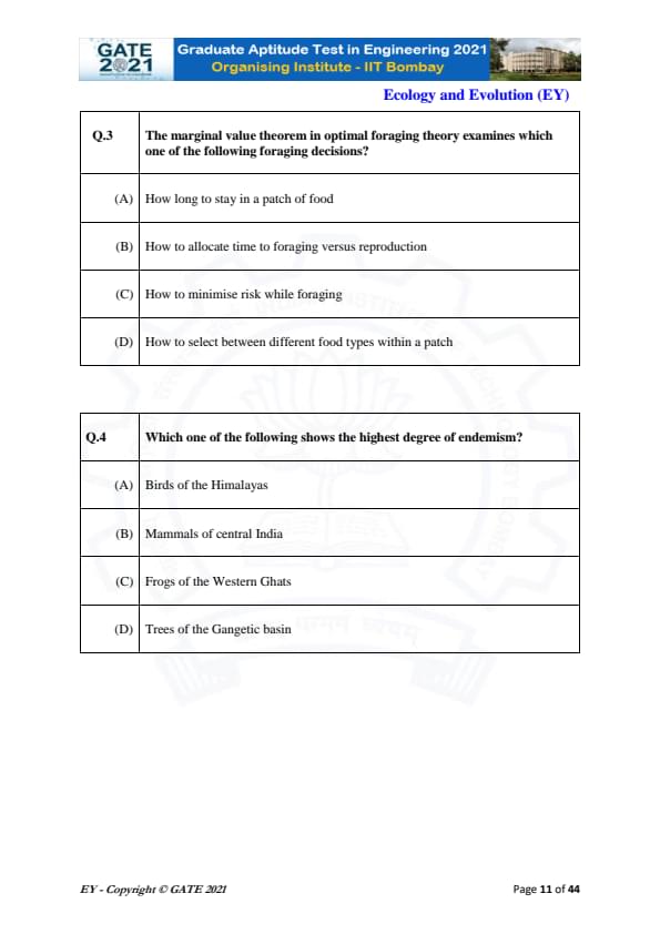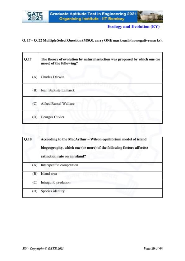 GATE 2021 Ecology and Evolution (EY) Question Paper with Solutions