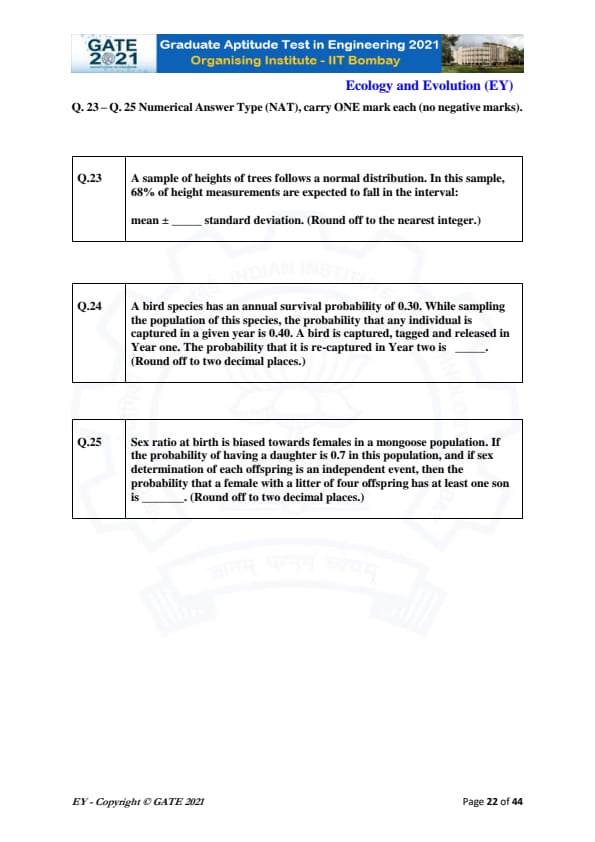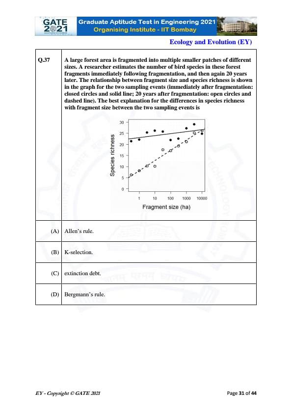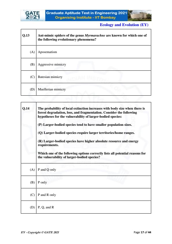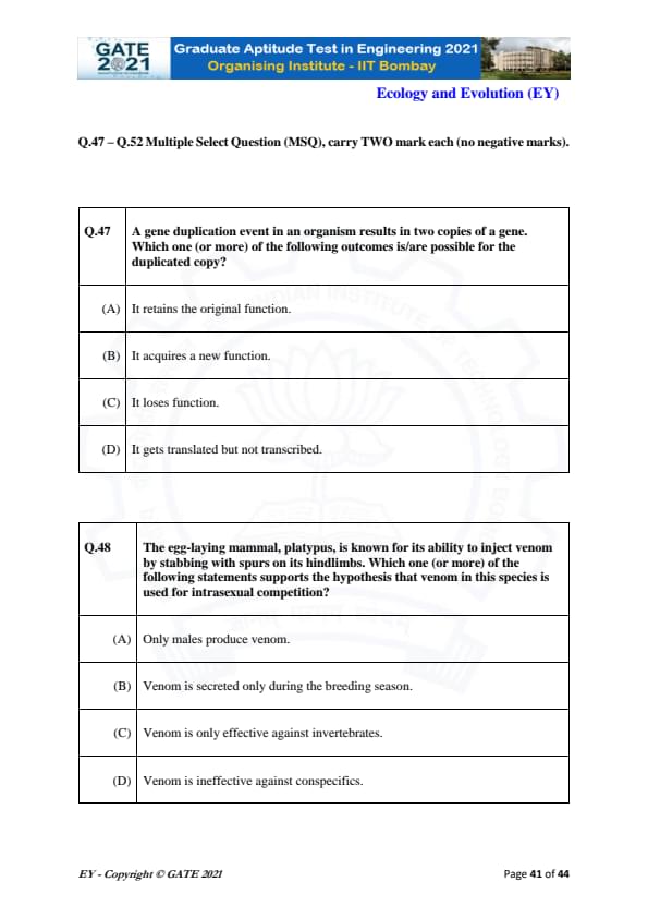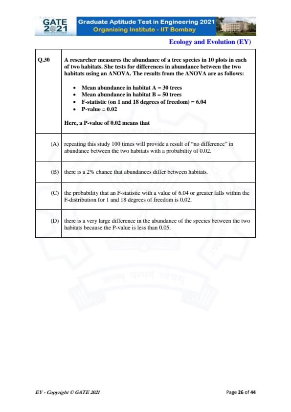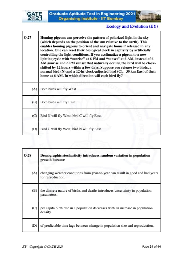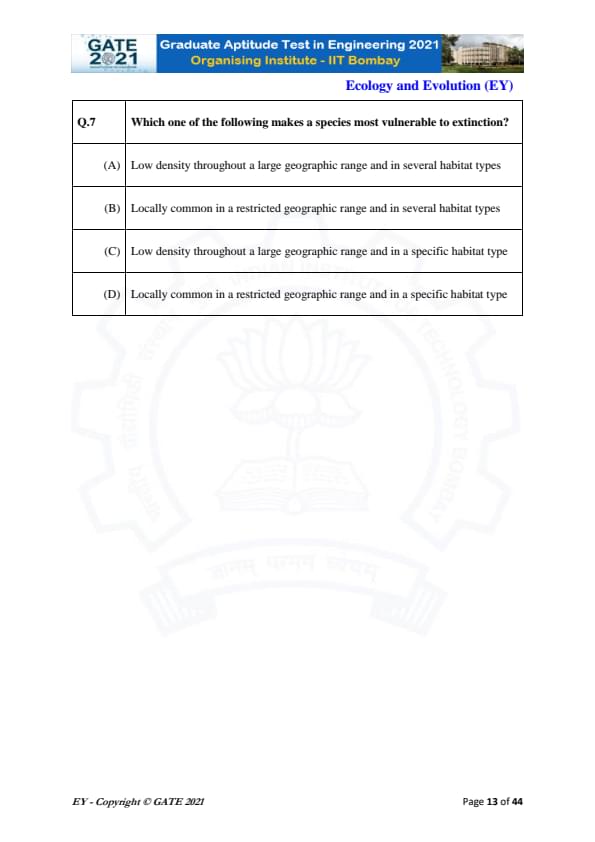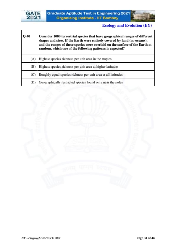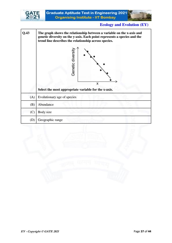 GATE 2021 Ecology and Evolution (EY) Question Paper with Solutions