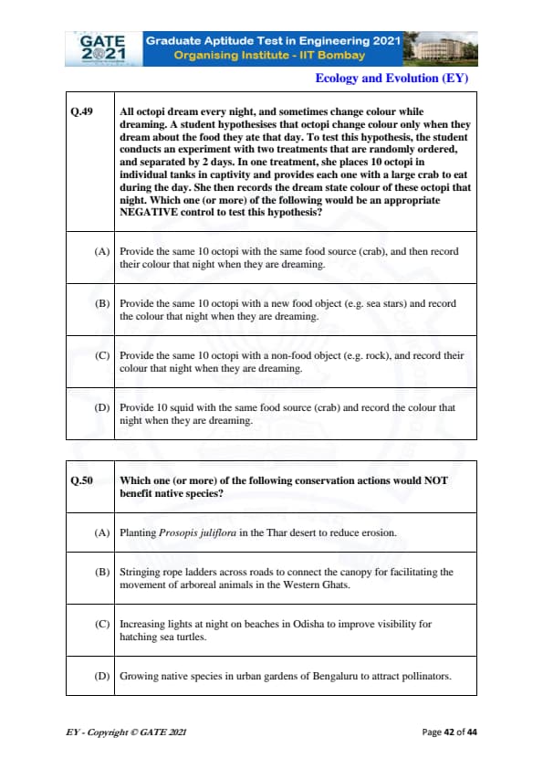 | GATE 2021 Ecology and Evolution (EY) Question Paper | Check Solutions |
