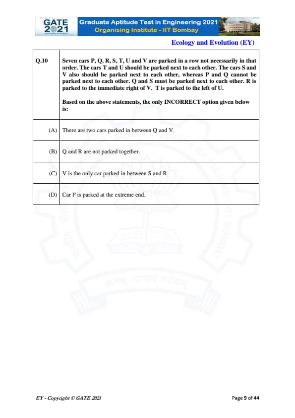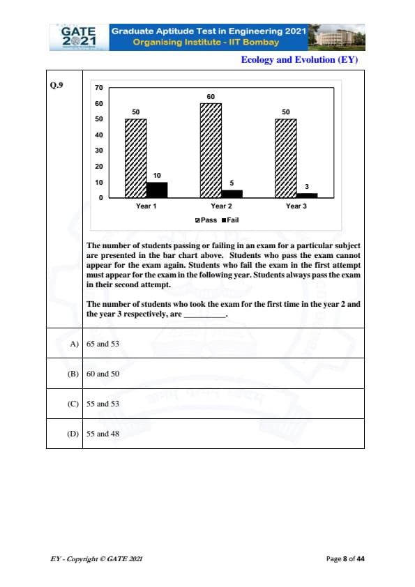 GATE 2021 Ecology and Evolution (EY) Question Paper with Solutions PDFs can be downloaded from here. On 7th February 2021 IIT Bombay successfully conducted GATE 2021 EY in the forenoon session (9:30 AM to 12:30 PM). There were a total of 65 questions that were distributed in two sections i.e General Aptitude and core EY topics. 10 questions appeared from the General Aptitude section, holding 15% of the total weightage. The rest of the 85% were distributed between core EY topics. The overall difficulty level of the exam was Moderate.