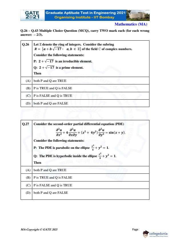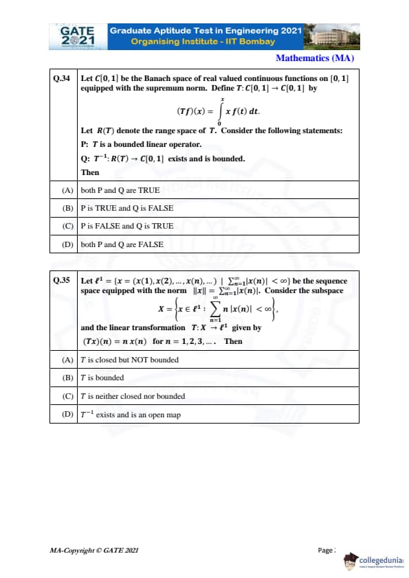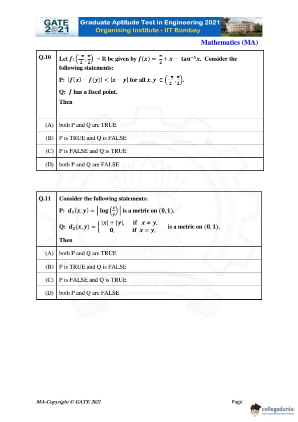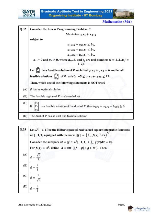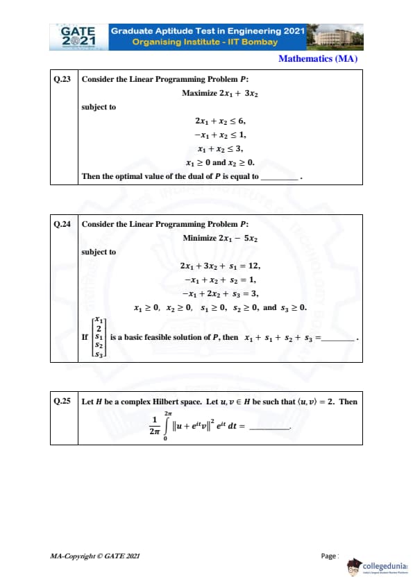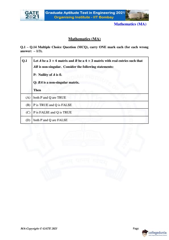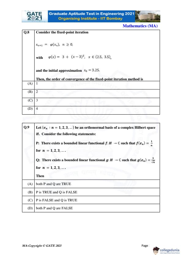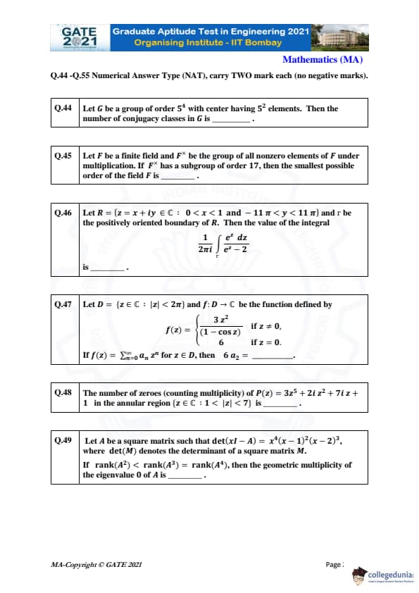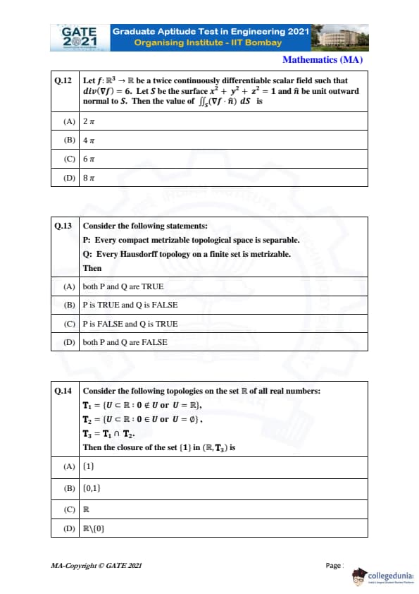 | GATE 2021 Mathematics (MA) Question Paper | Check Solutions |