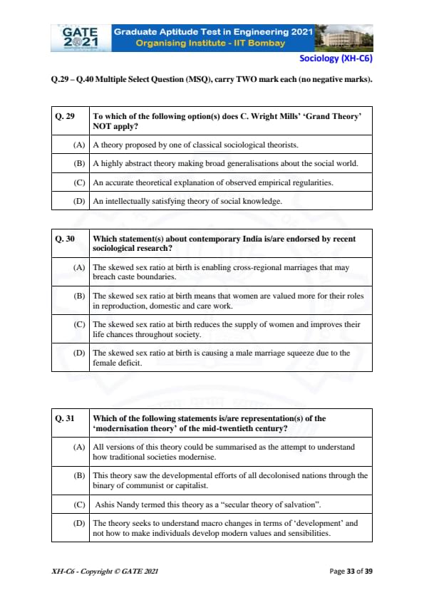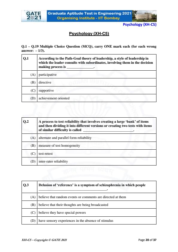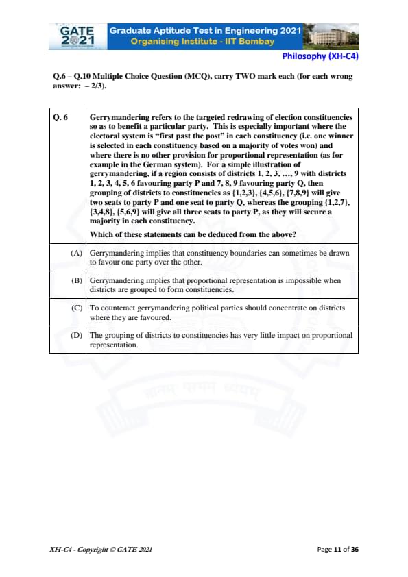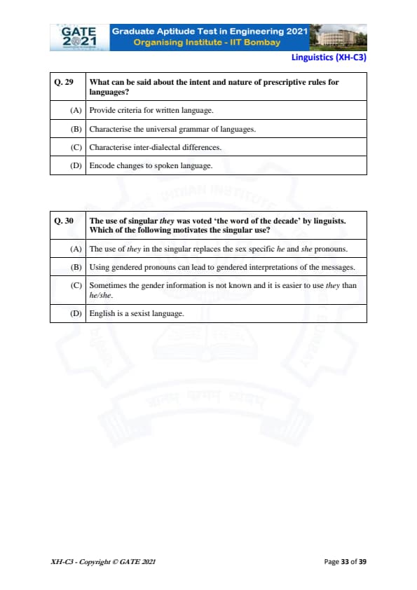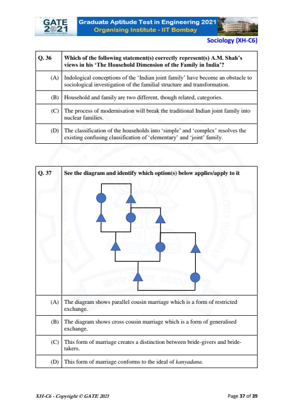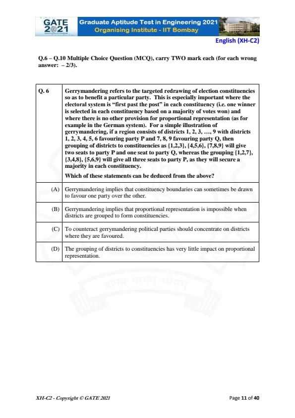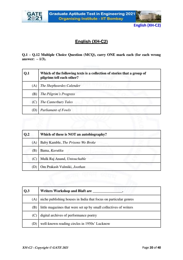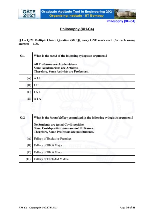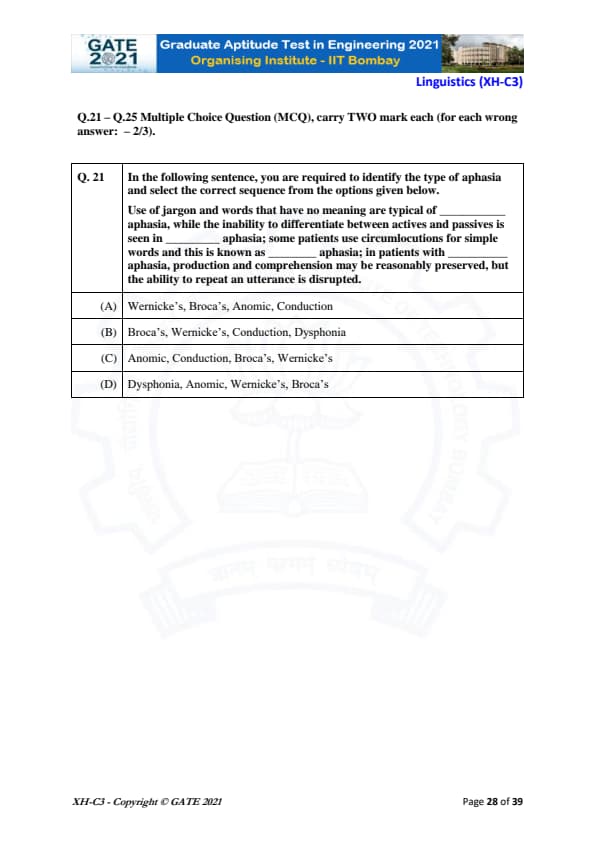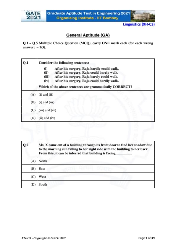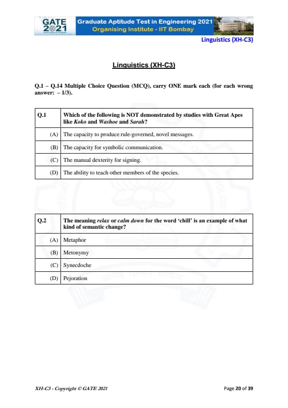 GATE 2021 XH Exam Pattern and Marking Scheme