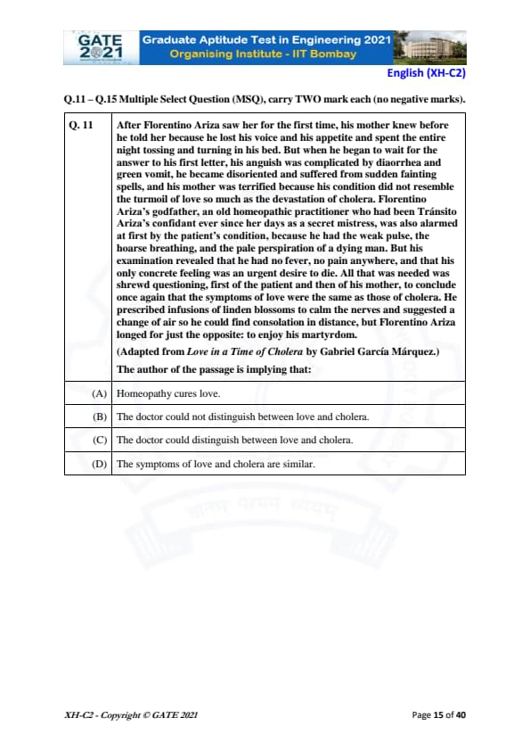 - The General Aptitude section carried 15 marks, distributed between 10 MCQs (each 5 questions carrying 1 mark and 2 marks respectively)