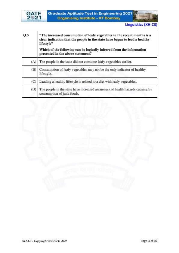 Thus, the most appropriate inference is that leading a healthy lifestyle is related to a diet with leafy vegetables. Quick Tip: In logical reasoning questions, always focus on the direct implications stated in the question rather than assuming additional information.