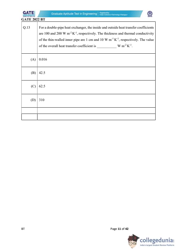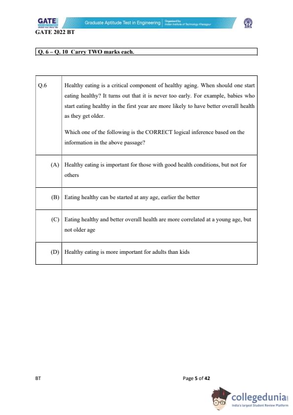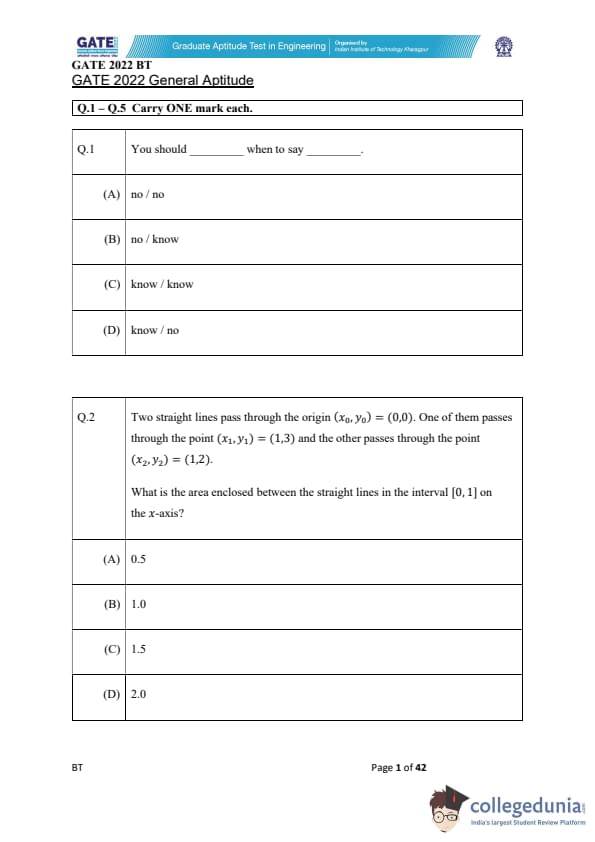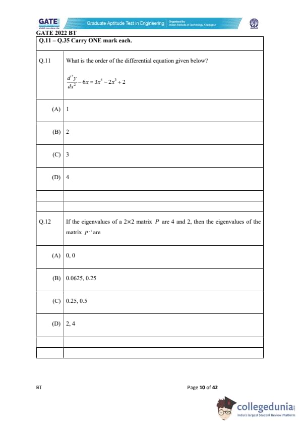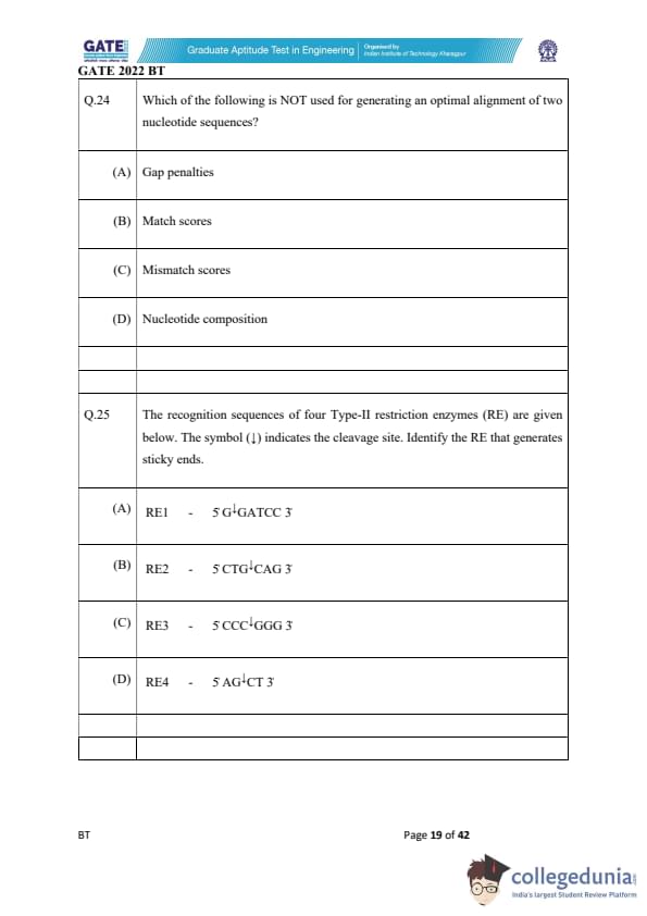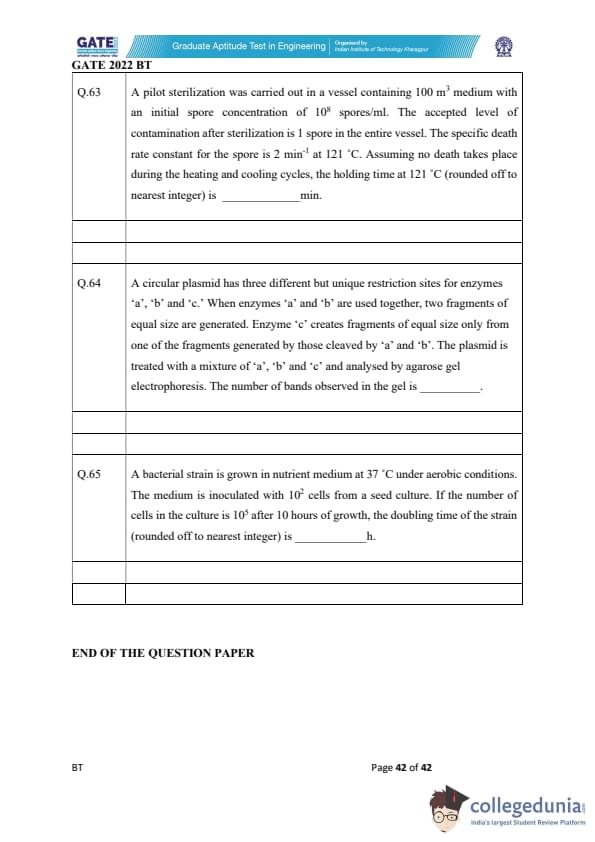 GATE 2023 BT Question Paper and Answer Key PDFs are out now. GATE 2022 BT was held in February 12, 2022 by IIT Kharagpur. The duration of the exam was 180 minutes. The question paper of GATE 2022 BT was a set of 65 questions that were distributed between two parts i.e. General Aptitude and Biotechnology. 10 questions were related to General Aptitude, while the remaining 55 questions were related to core Biotechnology including Engineering Mathematics. Nearly 70% of the total weightage was carried by core Biotechnology sections.