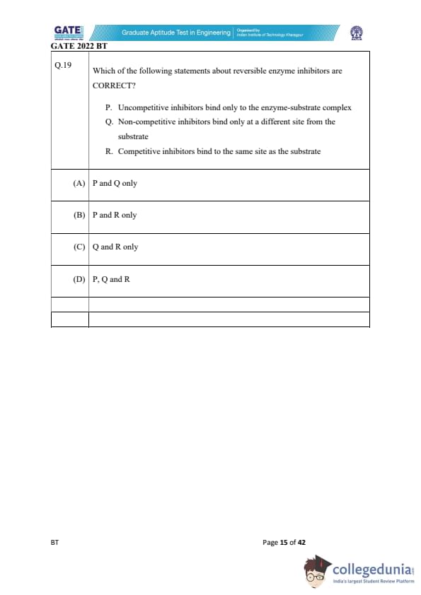 | 6 | Which of the following statements about reversible enzyme inhibitors are CORRECT? (A) P and Q only (B) P and R only (C) Q and R only (D) P, Q and R | D | All three statements describe reversible enzyme inhibitors accurately: P (uncompetitive), Q (non-competitive), and R (competitive). |