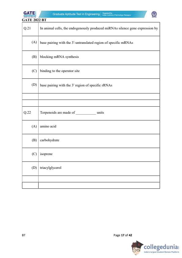 | GATE 2022 BT Question Papers | GATE 2022 BT Answer Key | GATE 2022 BT Solution |